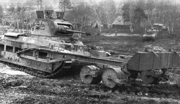 Британский катковый минный трал AMRA (Anti-Mine-Roller-Attachement), установленный на пехотном танке Mk.II Matilda