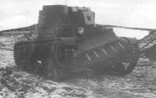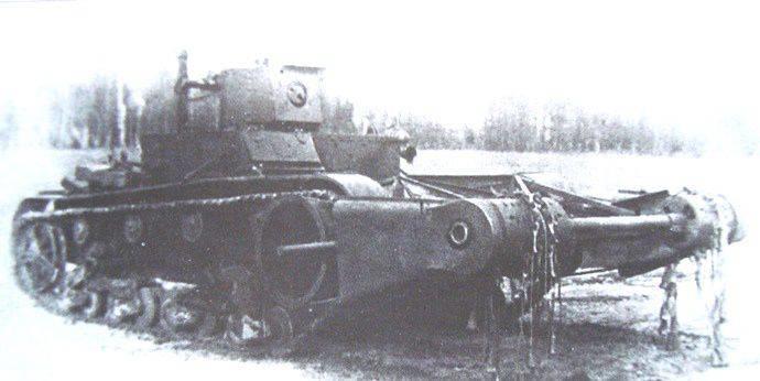Т-26 двубашенный с экспериментальным тралом - лезвием (поднят в транспортное положение)