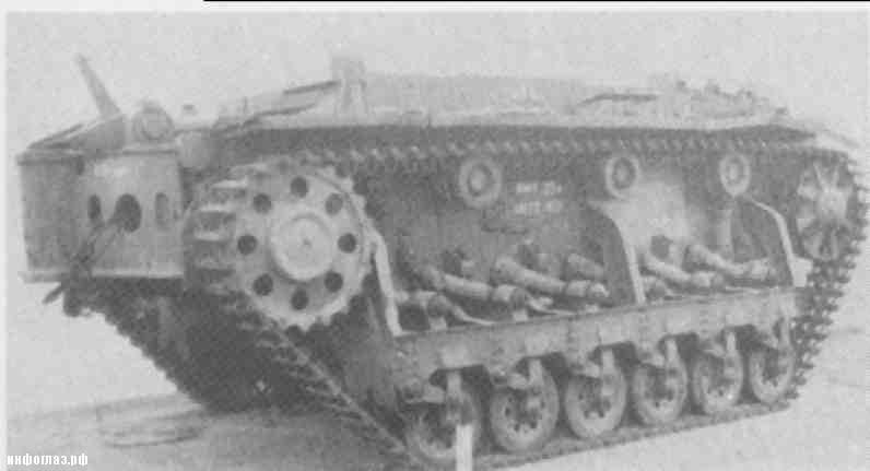 С навесным тралом - выглядело так. Катки из бетона - дешево сердито. На вооружение не пошло, опять же. Оказалось, что при взрывах мин и такое шасси разрушается неприемлемо.