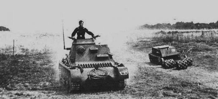 Прототип немецкого минного трала Alkett VsKfz 617 Minenräumer. Передняя часть корпуса и башня с пулемётами MG34 «заимствованы» от лёгкого танка Panzerkampfwagen I. Единственный построенный экземпляр захвачен советскими войсками в Германии