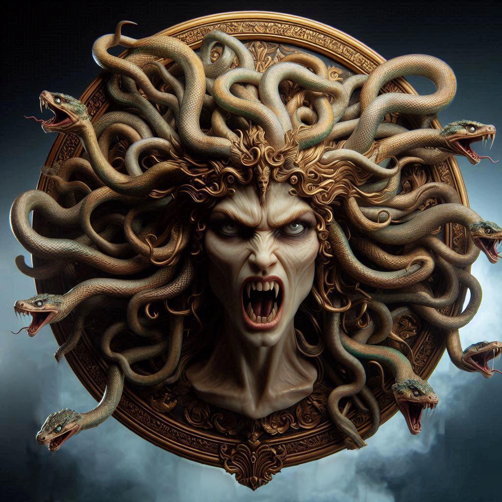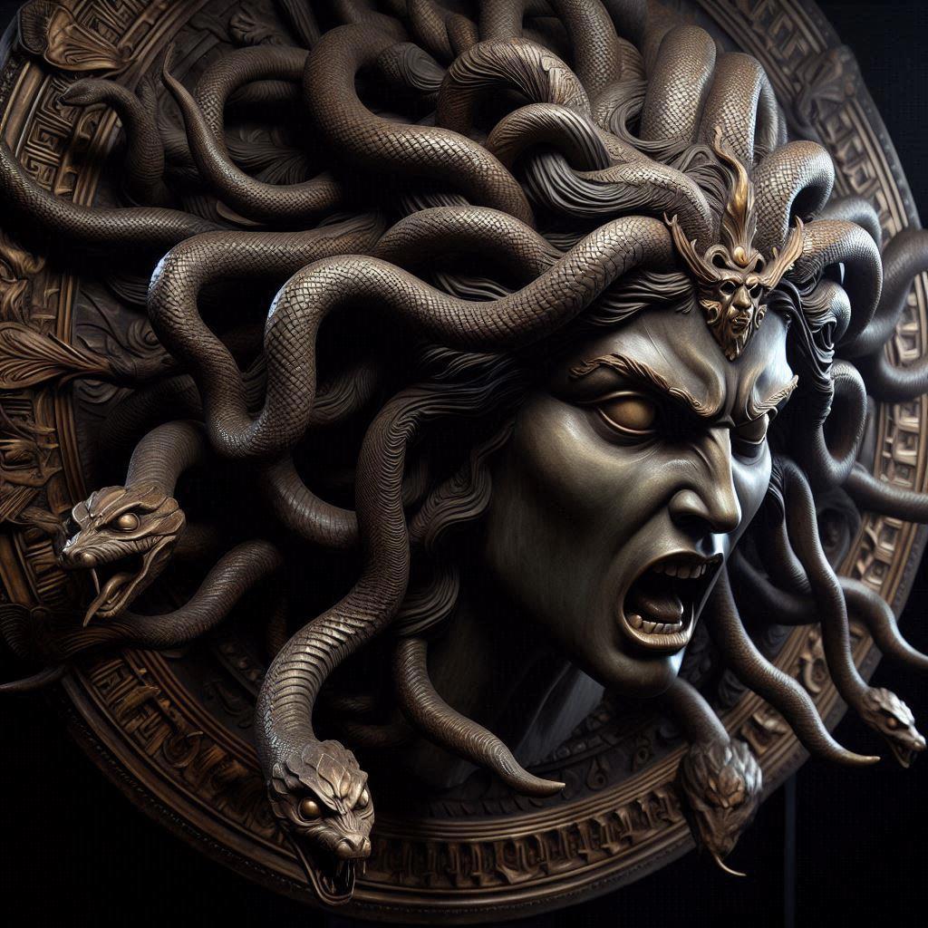 Конкретно эта горгона - понятное дело, Медуза: перед вами эгида, то есть щит, на который была помещена ее отрубленная голова.