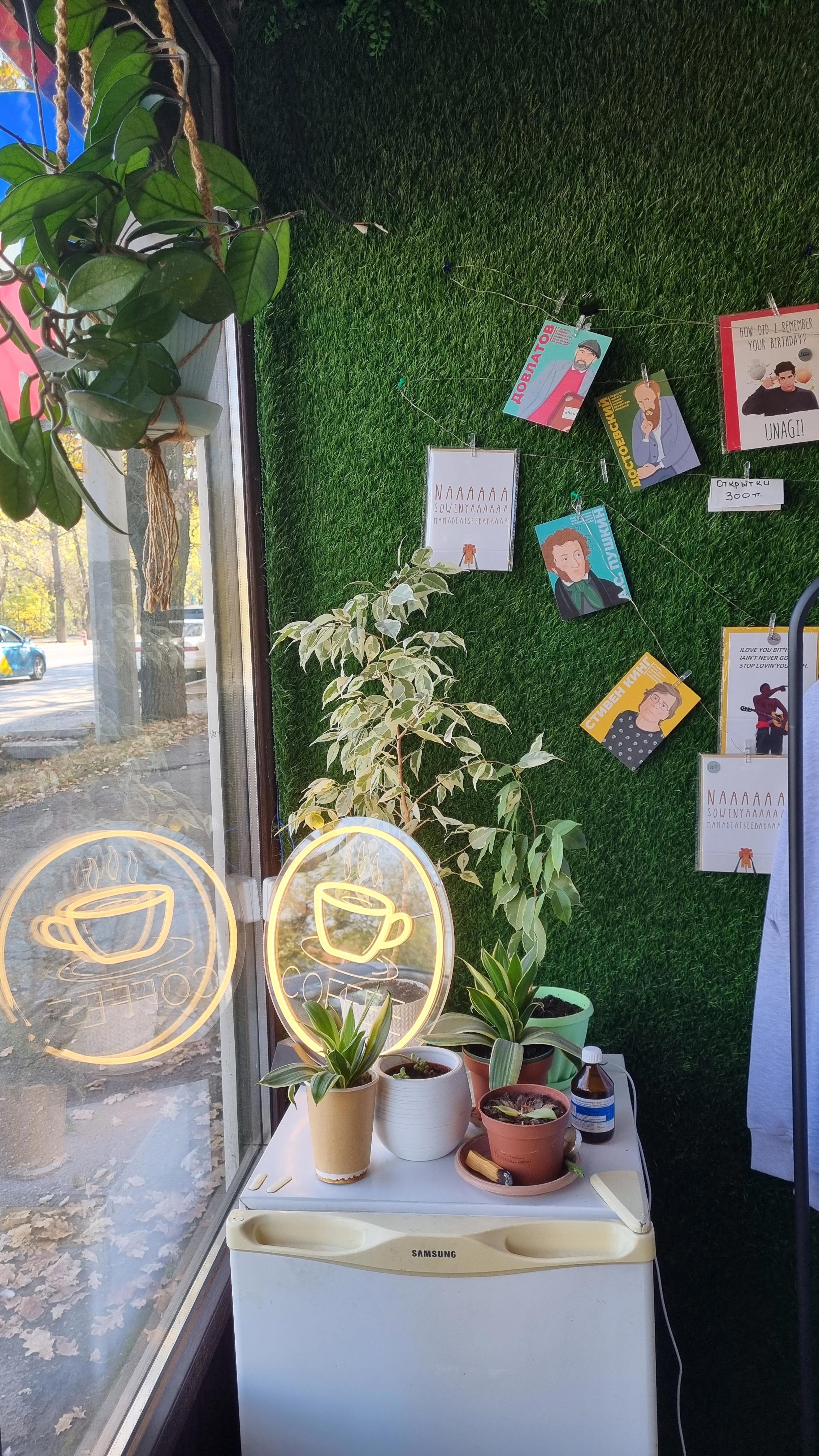 Мое внимание привлекла такая витрина. Кафе-точка расположена на первом этаже четырехэтажного дома. Решила зайти, интересно стало, что происходит там за стеклом.