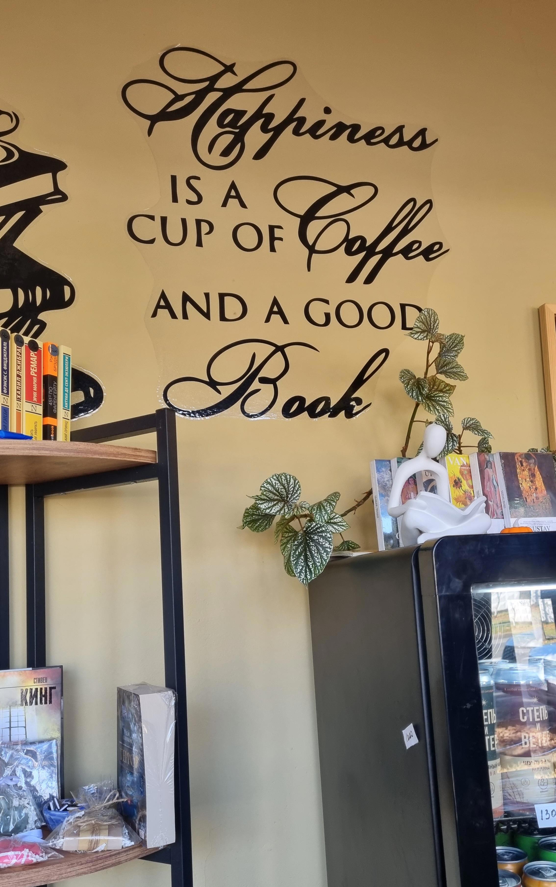 При входе, напротив на стене сразу бросилась в глаза такая красивая надпись. Помещение кафе небольшое, но уютное, все выполнено в мягких тонах. Рядом другая надпись и этажерка с книгами.
