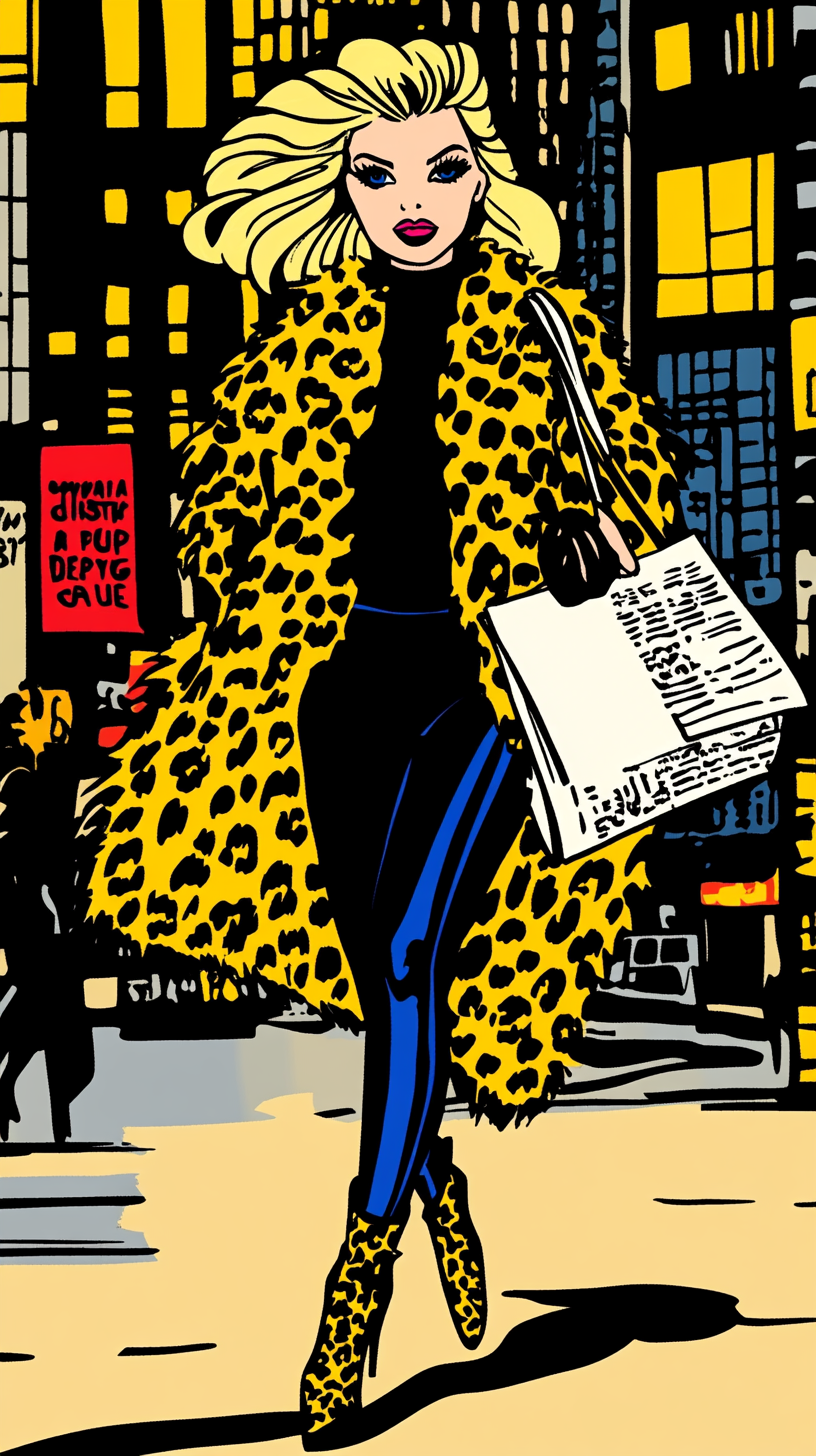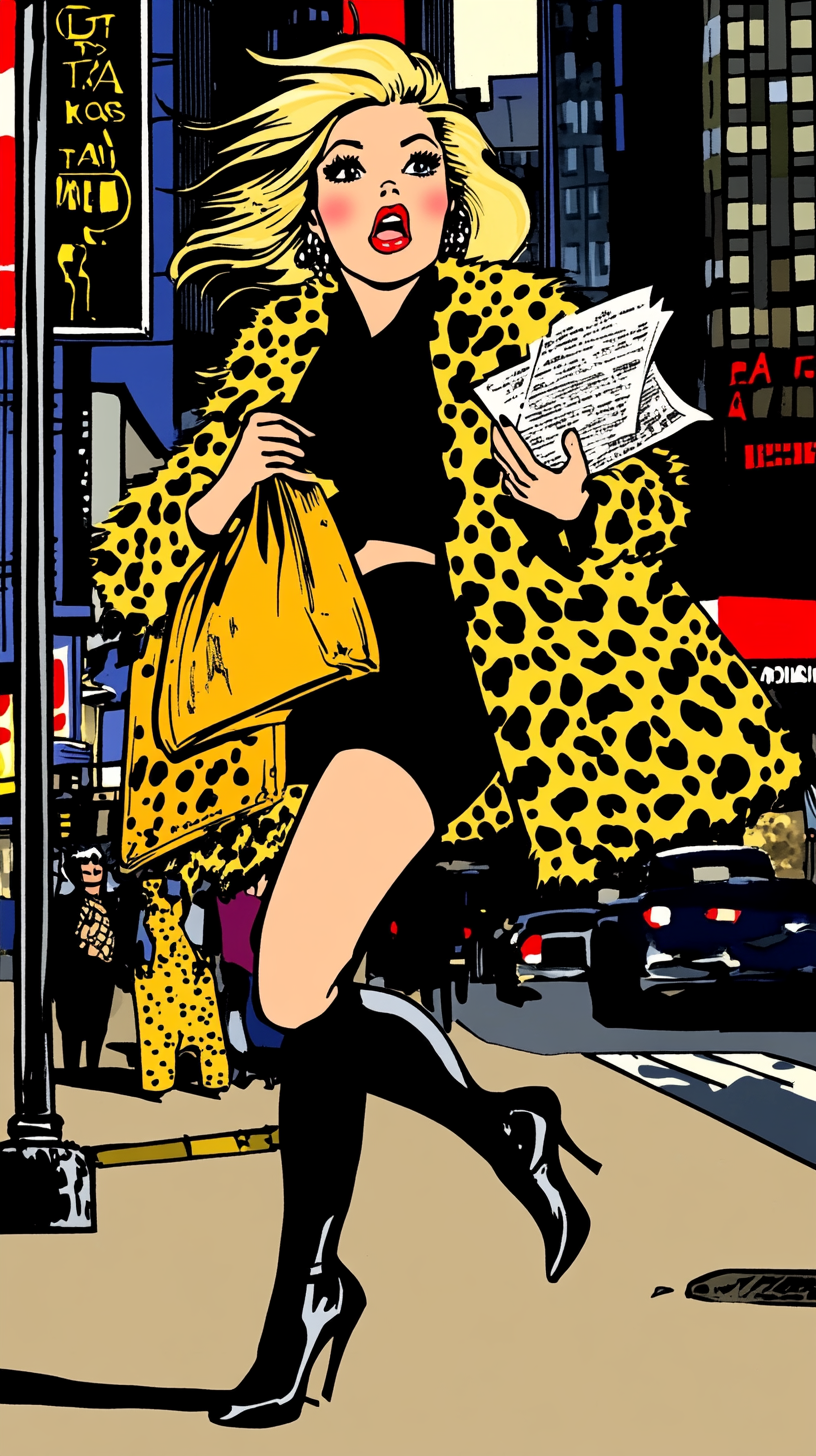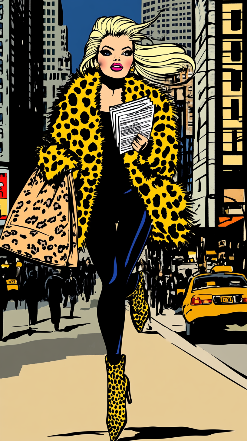 ТЗ: Мне нужна картинка: девушка, бежит по городу, журналист, сумка на перевес, на каблуках, в леопардовой шубе, в брюках, блондинка. Характер : ядовитая Оля:)