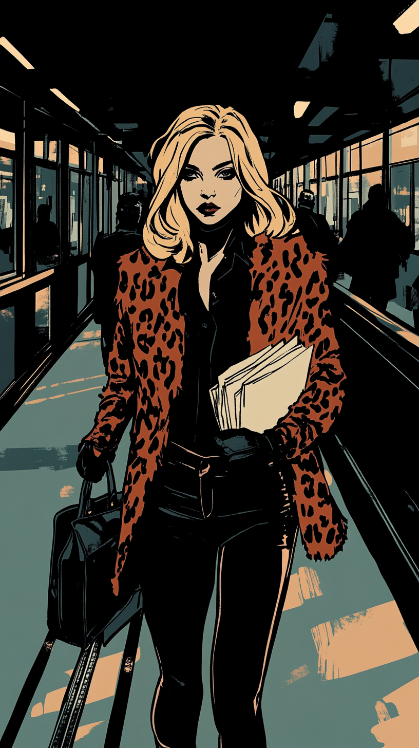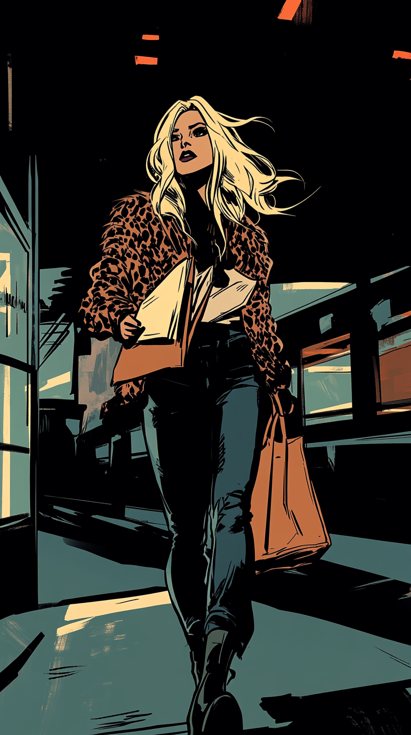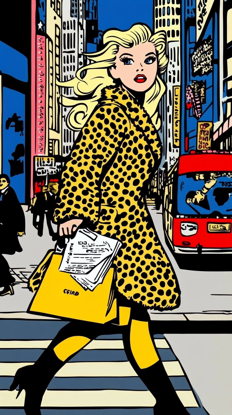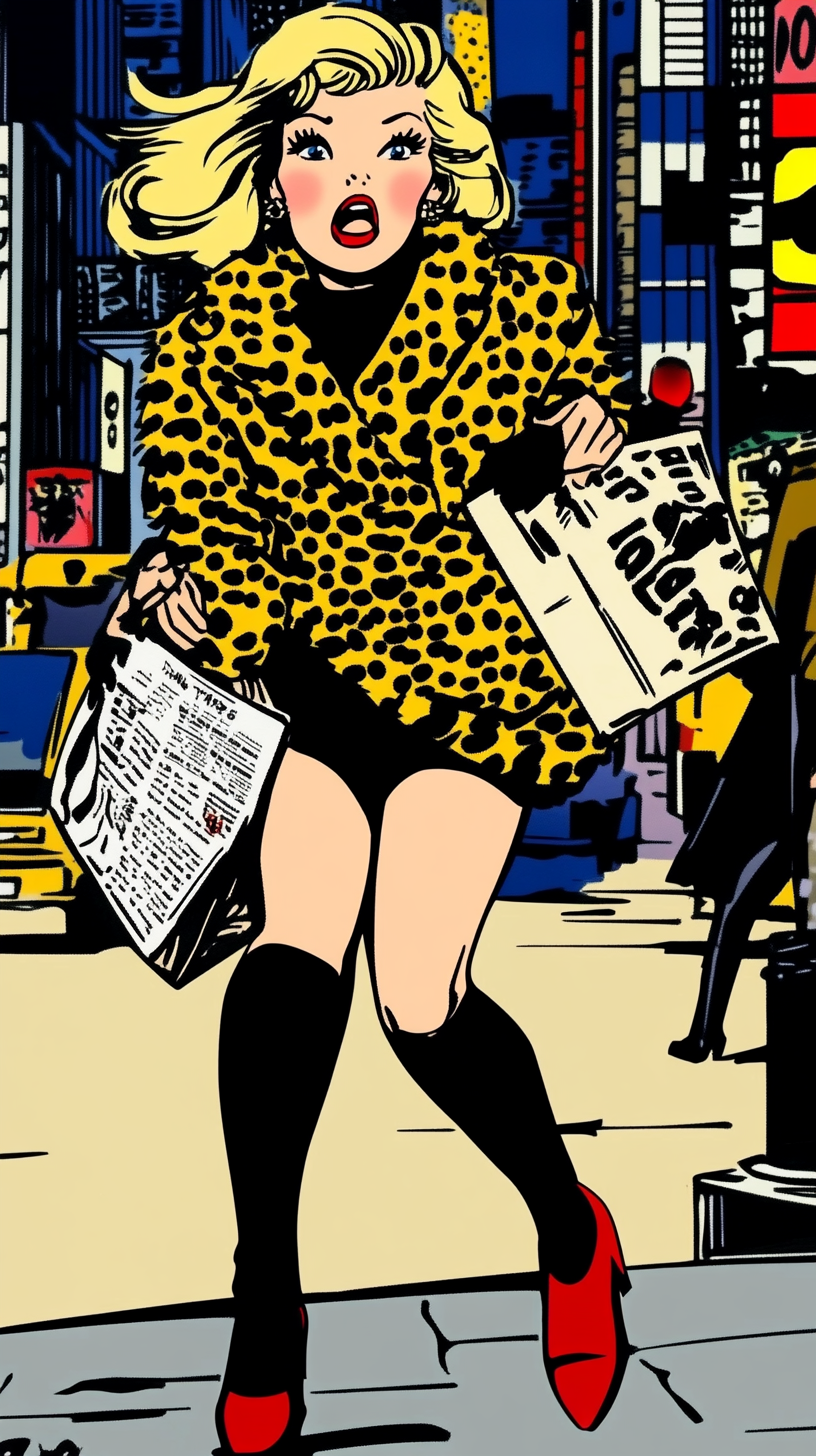 ТЗ: Мне нужна картинка: девушка, бежит по городу, журналист, сумка на перевес, на каблуках, в леопардовой шубе, в брюках, блондинка. Характер : ядовитая Оля:)