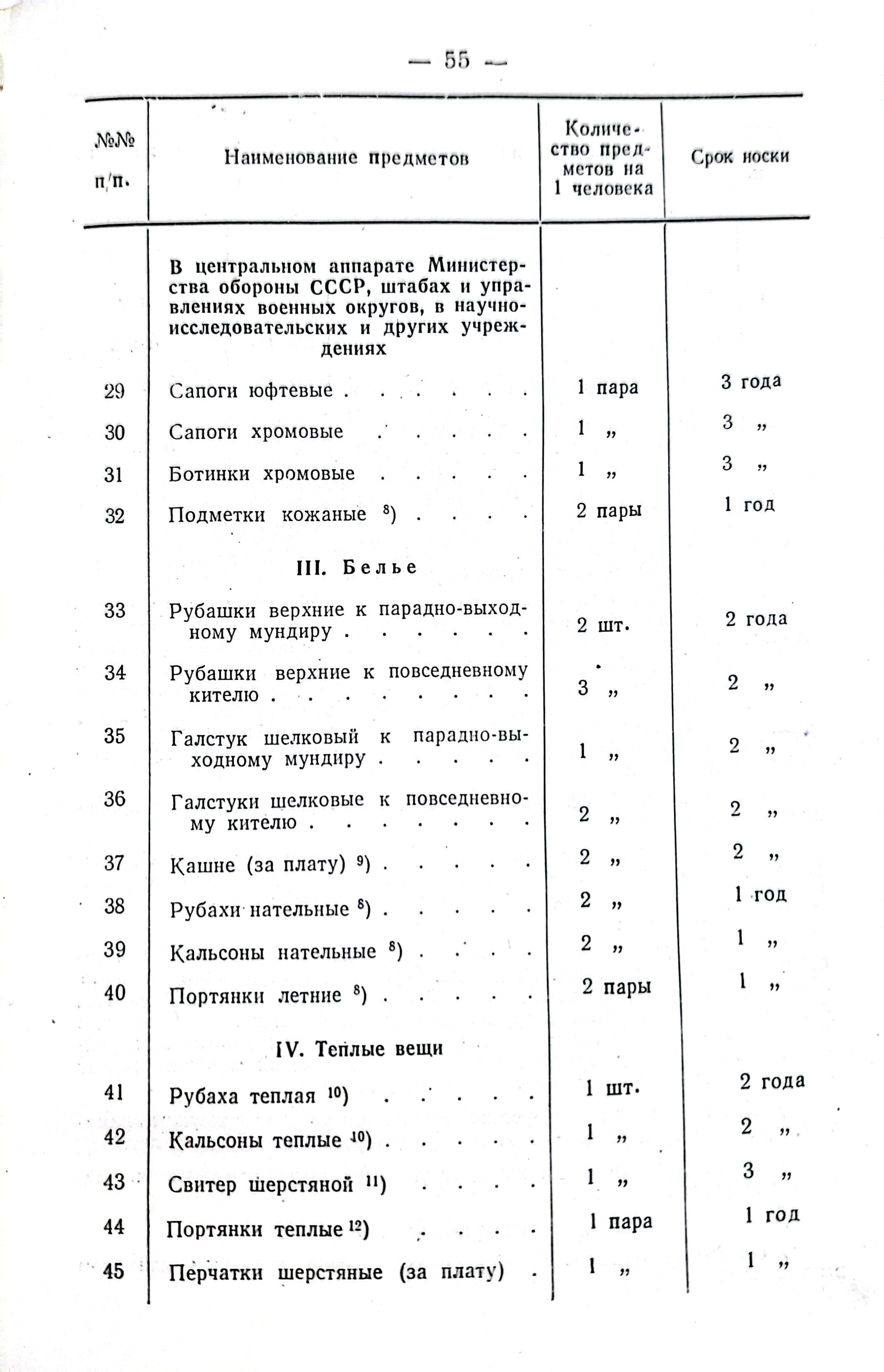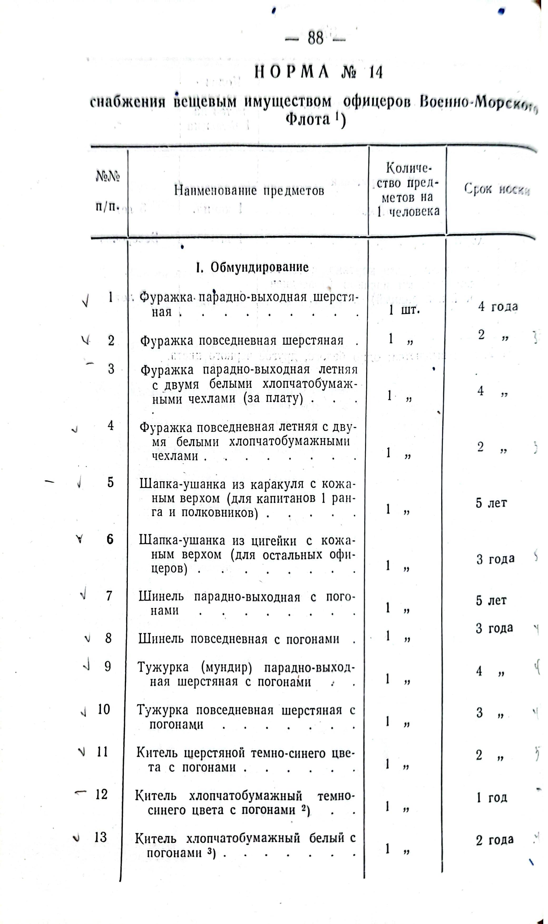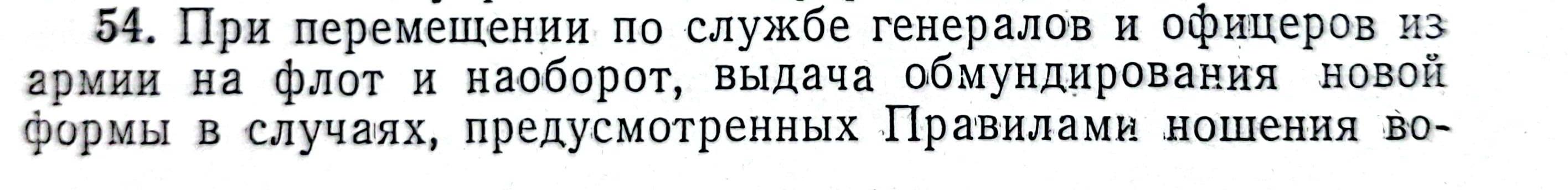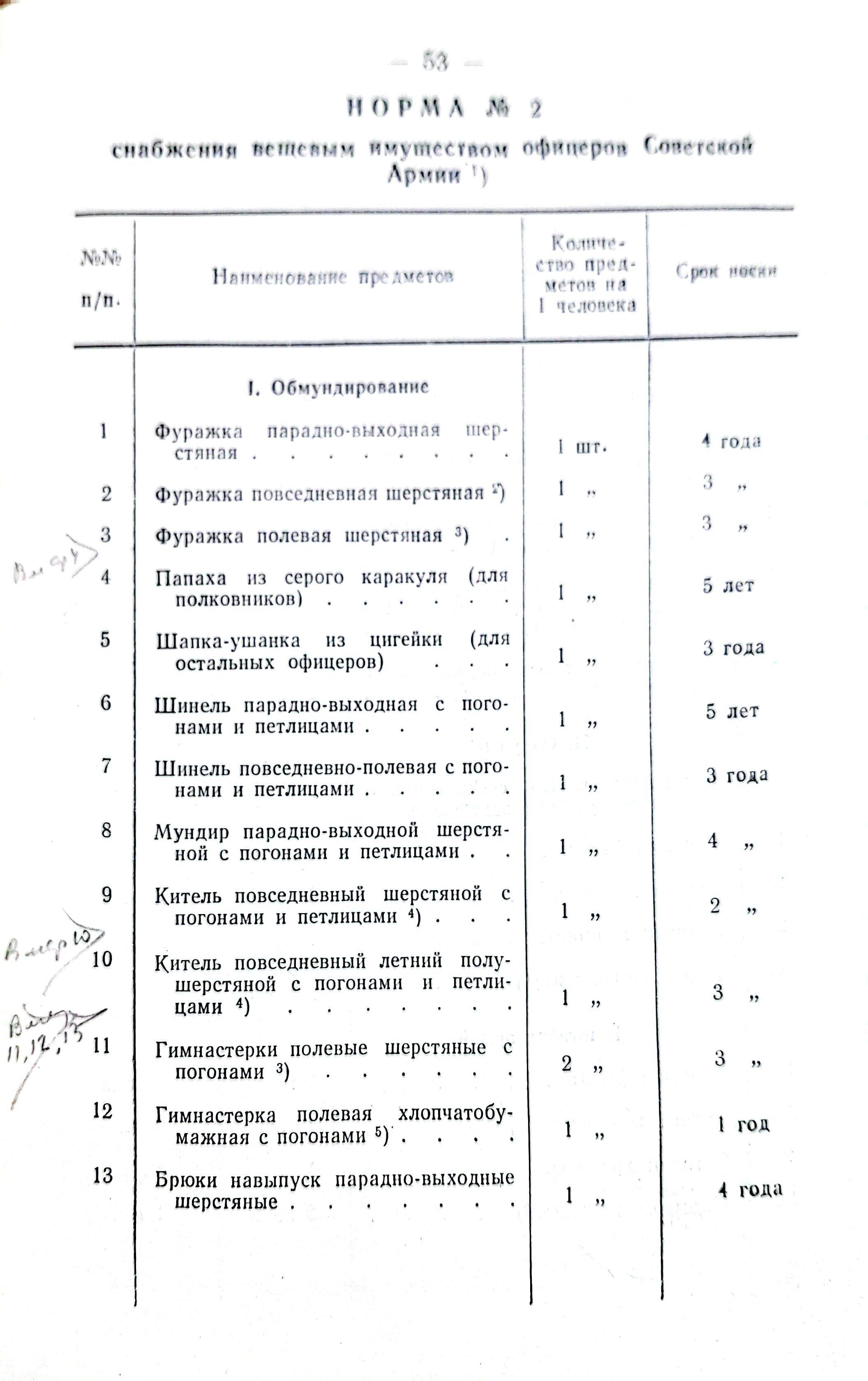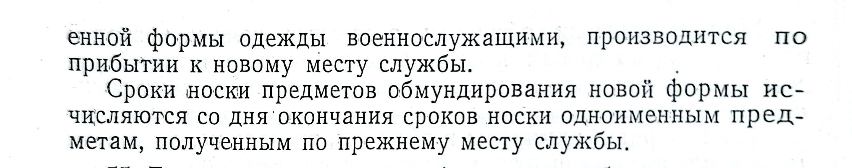 Объясню в чем дело. Возьмём, к примеру, офицера ВМФ, отслужившего один год, после окончания военно-учебного заведения. По выпуску ему выдали шапку, шинель, тужурку и всё остальное, что по нормам положено (Нормы снабжения офицеров ВМФ и офицеров СА – под спойлером). Через год службы ему предложили перевод в Ракетные войска. Он согласился и получив общевойсковое обмундирование, флотскую форму спрятал в чулан. А теперь смотрим нормы: по ним выходит, что оставшийся срок шапки-ушанки из цигейки с кожаным верхом – 3 года, шинели повседневной и тужурки – аналогично. То есть носить их офицеру ещё пару лет. «Сухопутную» шапку, шинель и китель ему выдали тоже на три года. Смотрим вновь статью 54 и понимаем, что следующая выдача обмундирования будет только через пять лет.