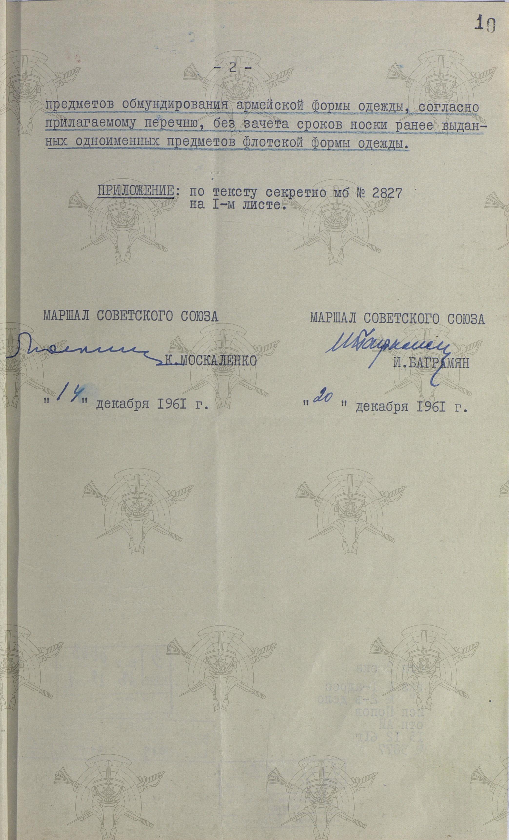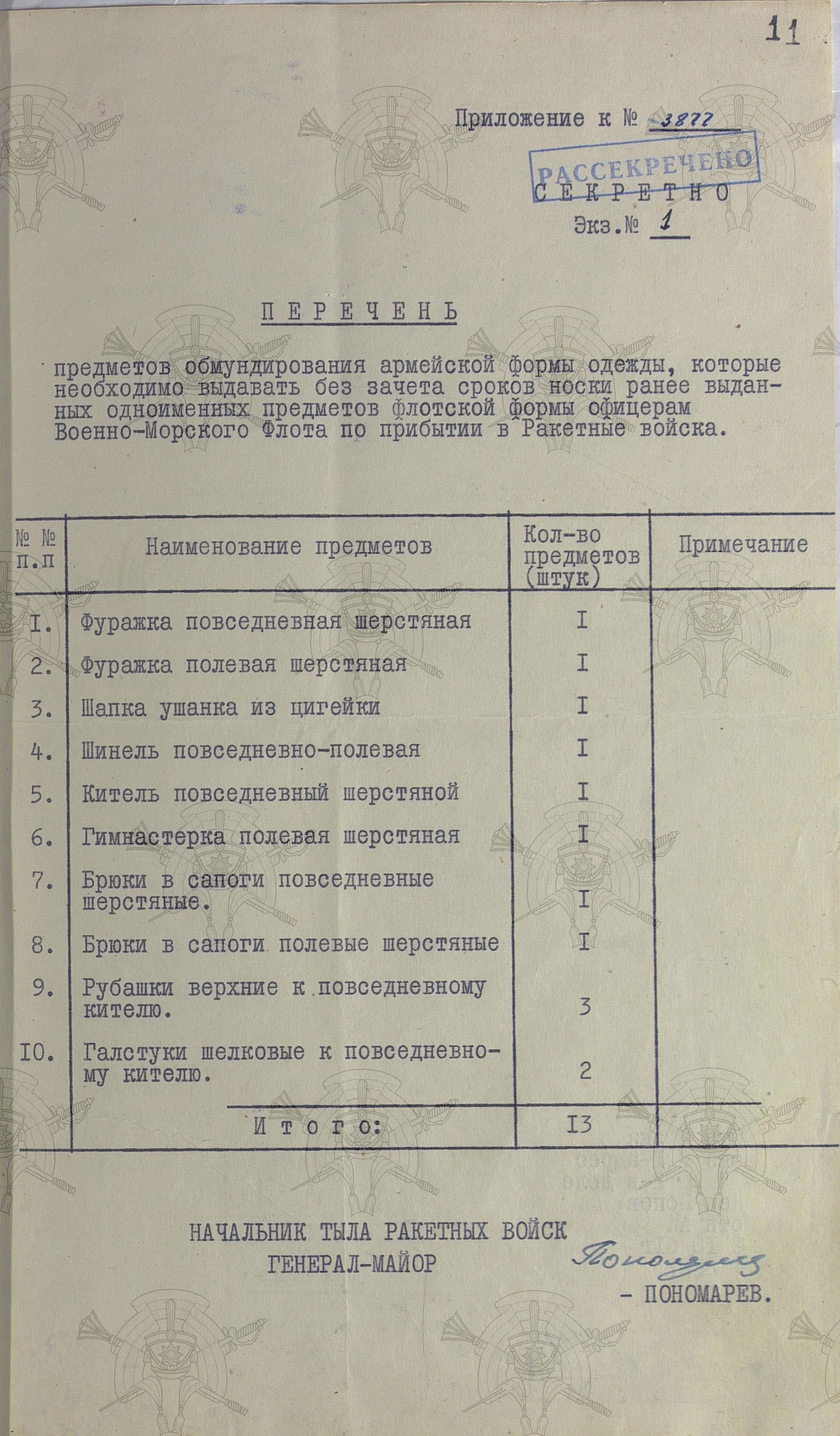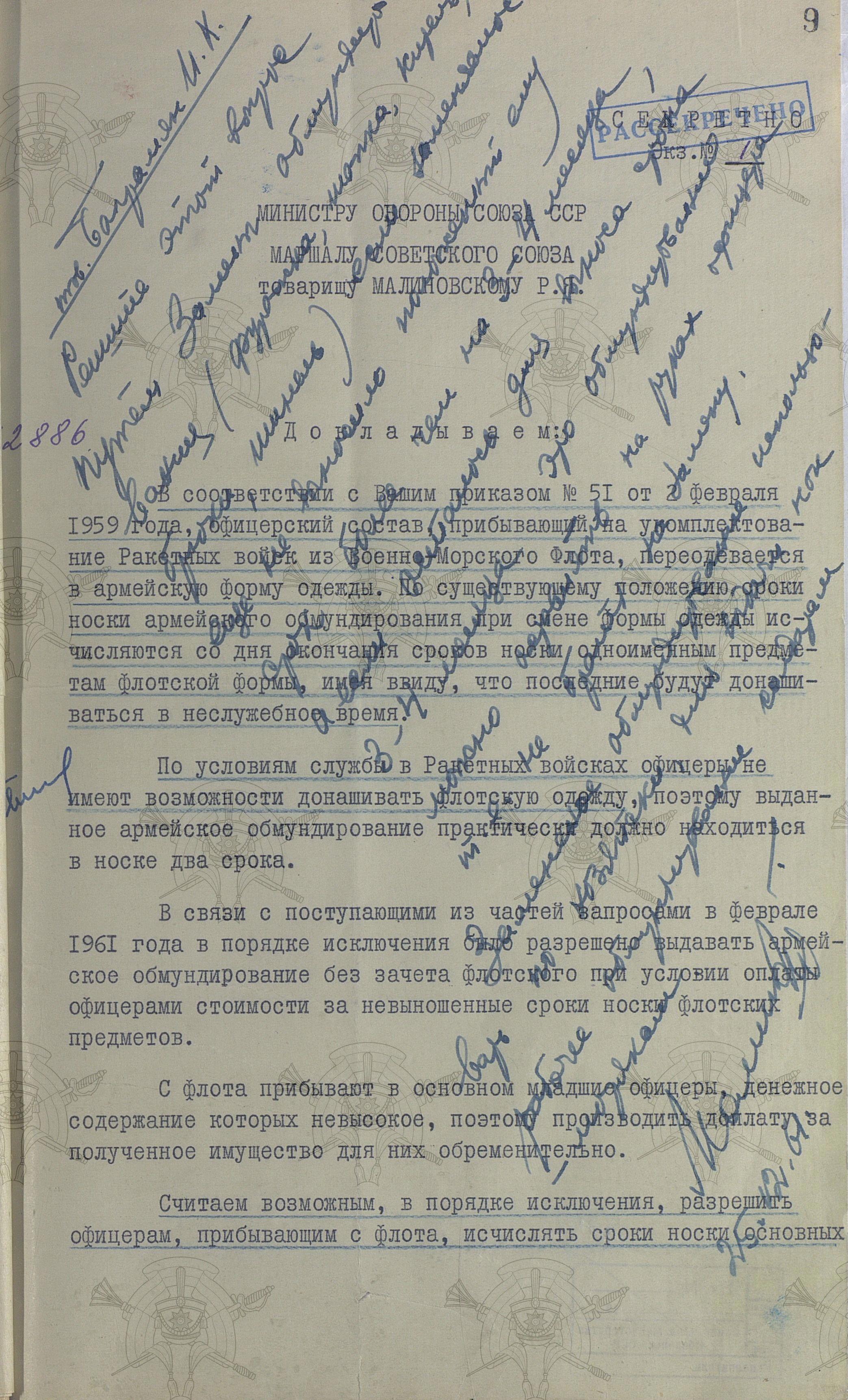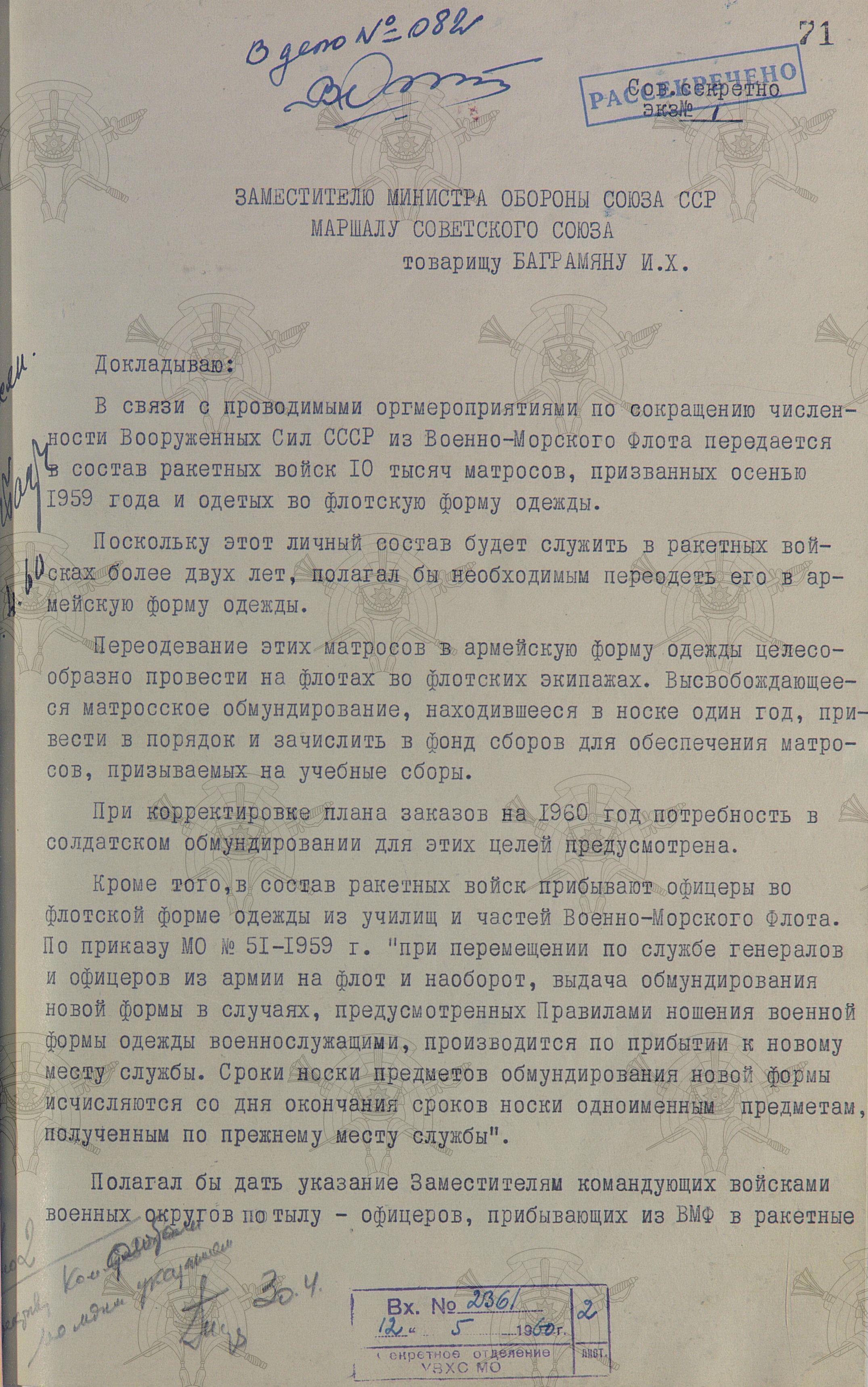 С матросами разобрались, а что же с офицерами ВМФ? Неужели с ними проблем не возникало? Ведь при численности в десять тысяч матросов, да ещё и с учётом особенности службы в РВСН и офицеров должно быть около тысячи. Проблема была, но несколько иного порядка. Но, прежде, чем объяснить некоторые особенности вещевого обеспечения офицерского состава, предлагаю ознакомиться с текстом доклада Маршала Советского Союза И.Х. Баграмяна на имя Министра обороны СССР Маршала Советского Союза Якова Родионовича Малиновского: