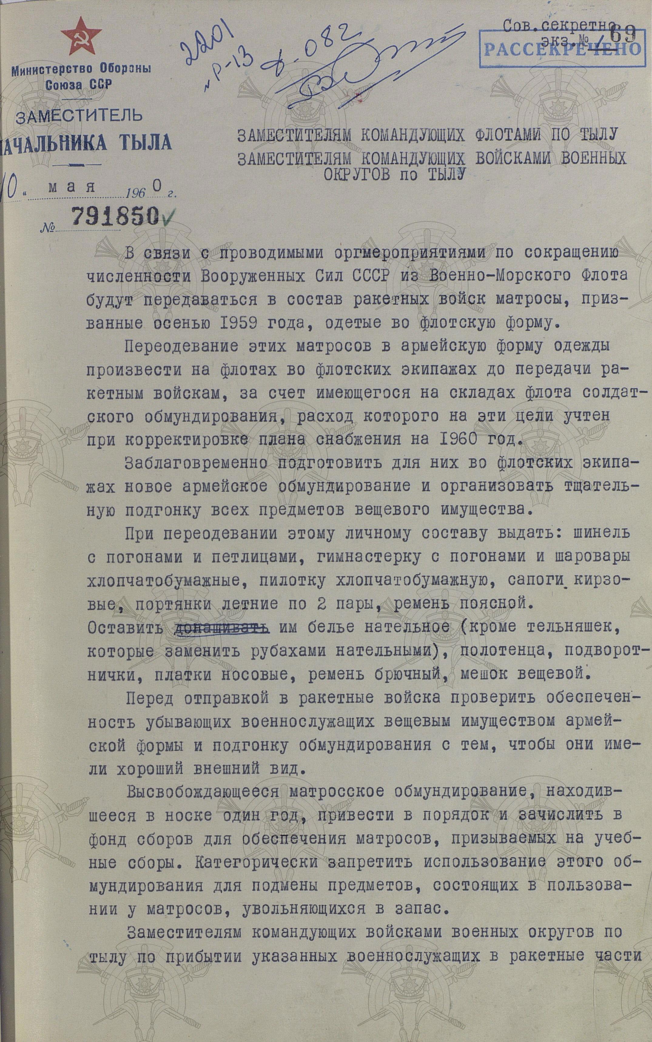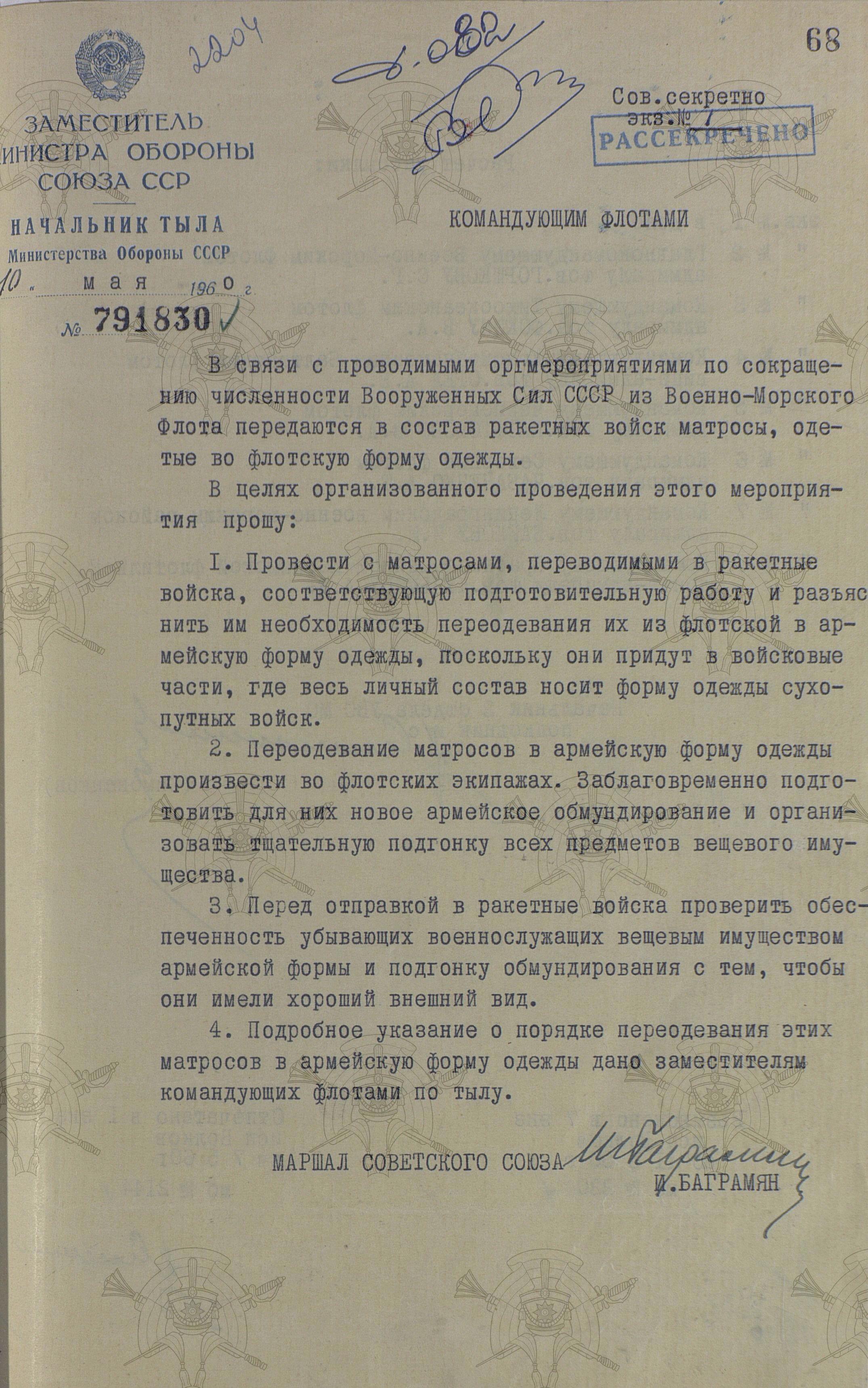 Обратите внимание на первый пункт документа, адресованного Командующим флотами: «Провести с матросами, переводимыми в ракетные войска, соответствующую подготовительную работу и разъяснить им необходимость переодевания из флотской в армейскую форму одежды, поскольку они придут в войсковые части, где весь личный состав носит форму одежды сухопутных войск.».
