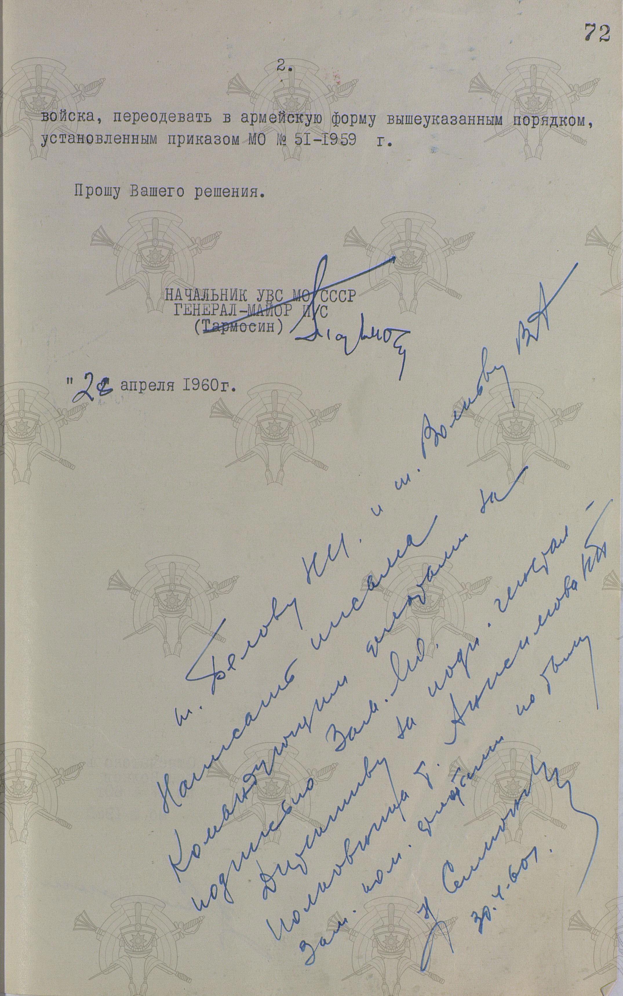 30-го апреля 1960 г., заместитель начальника УВС МО СССР полковник инт. сл. Симоненков Н.Г. накладывает следующую резолюцию: