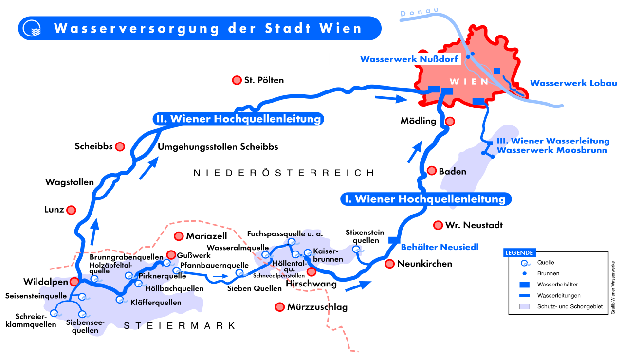 Причём, на счёт качества воды есть большие сомнения. 31-й магистрат Вены, в своём отчёте за 2020 год извещает население, что в воде содержится некое, не называемое количество ржавчины. Ибо чугун труб, по которым бежит вода с гор, уже давно и безнадежно повреждён ржавчиной. А на замену всей трассы на пластик - просто нет денег. Но, водоводы на акведуках в 2000 году заменили на пластиковые.