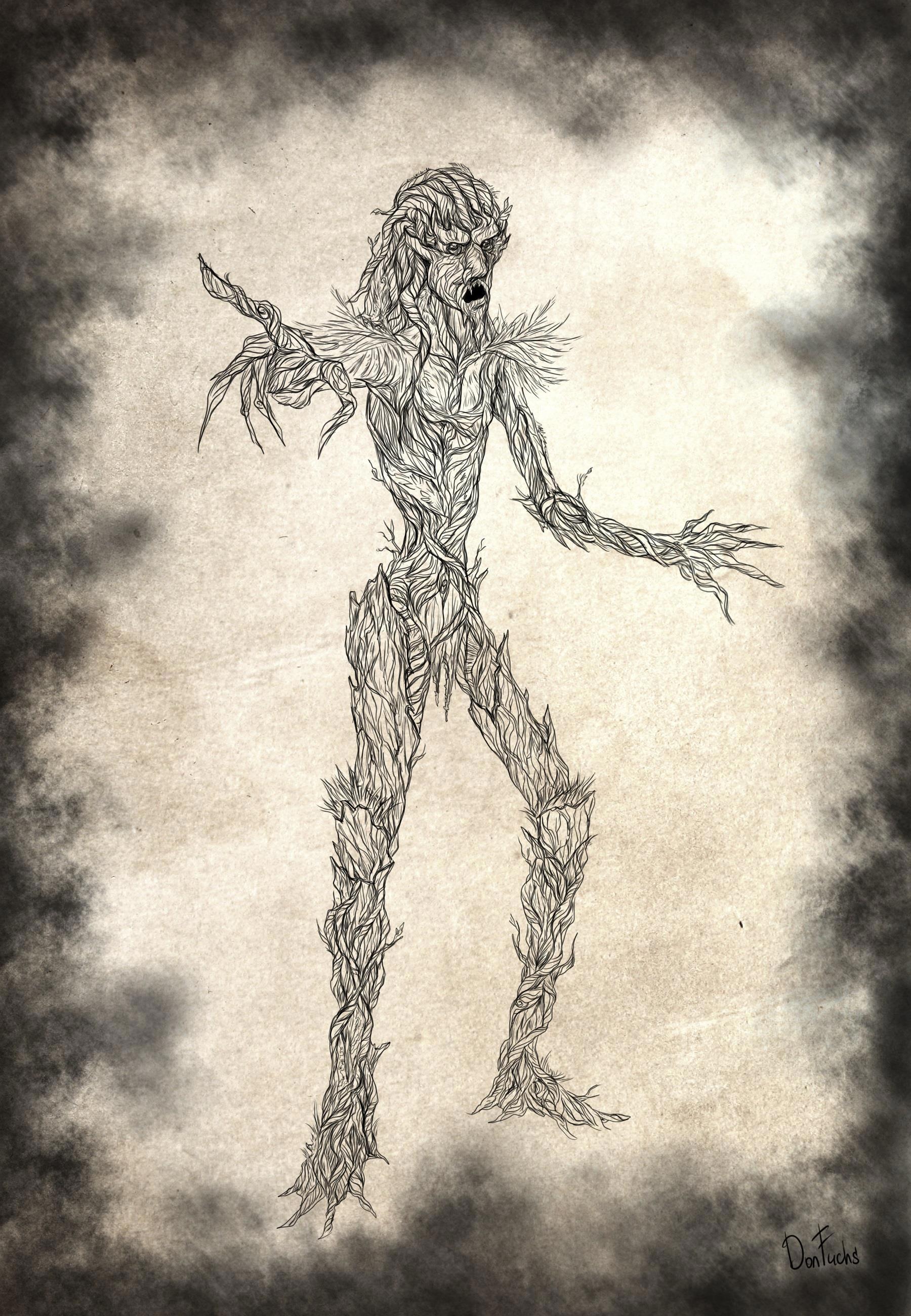 Стоящее перед нами существо лишь отдалённо напоминало человека. У него было тощее вытянутое тело, тёмно-зелёная, а местами тёмно-коричневая кожа и мутные водянистые глаза. Из его головы торчали толстые ветки, уходящие назад словно волосы. Торс и плечи покрывала трава, листья и прочая зелень. Движения существа можно было принять за резкие, однако на самом деле они были изящными, просто невероятно быстрыми.