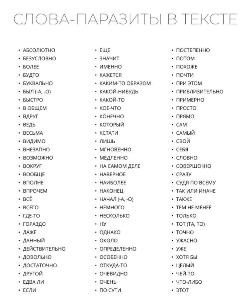 2. Убирает слова-паразиты, кое-где для этого приходится переформулировать фразу целиком. Есть список таких слов, их около 90. Ну я согласна, например, что обилие «было» очень обедняет текст. Или некоторые он, она, они можно и нужно заменять подходящими аналогами. Но посмотрите, какой там список!