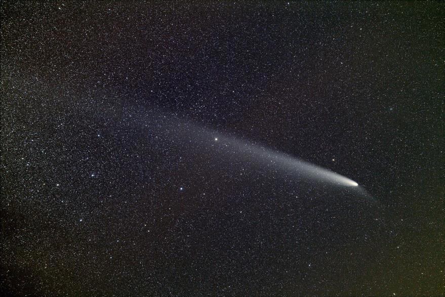 Комета Хейла-Боппа -- старая, с нее уже "песок сыплется", а потому пылевой хвост особенно ярок. С нашей нынешней гостьей все наоборот: ее газовый хвост ярче пылевого. Ее не слишком-то убедительный, но все же заметный противохвост -- именно пылевой. Что и понятно: газовый хвост не может быть направлен на Солнце ни при каких обстоятельствах.