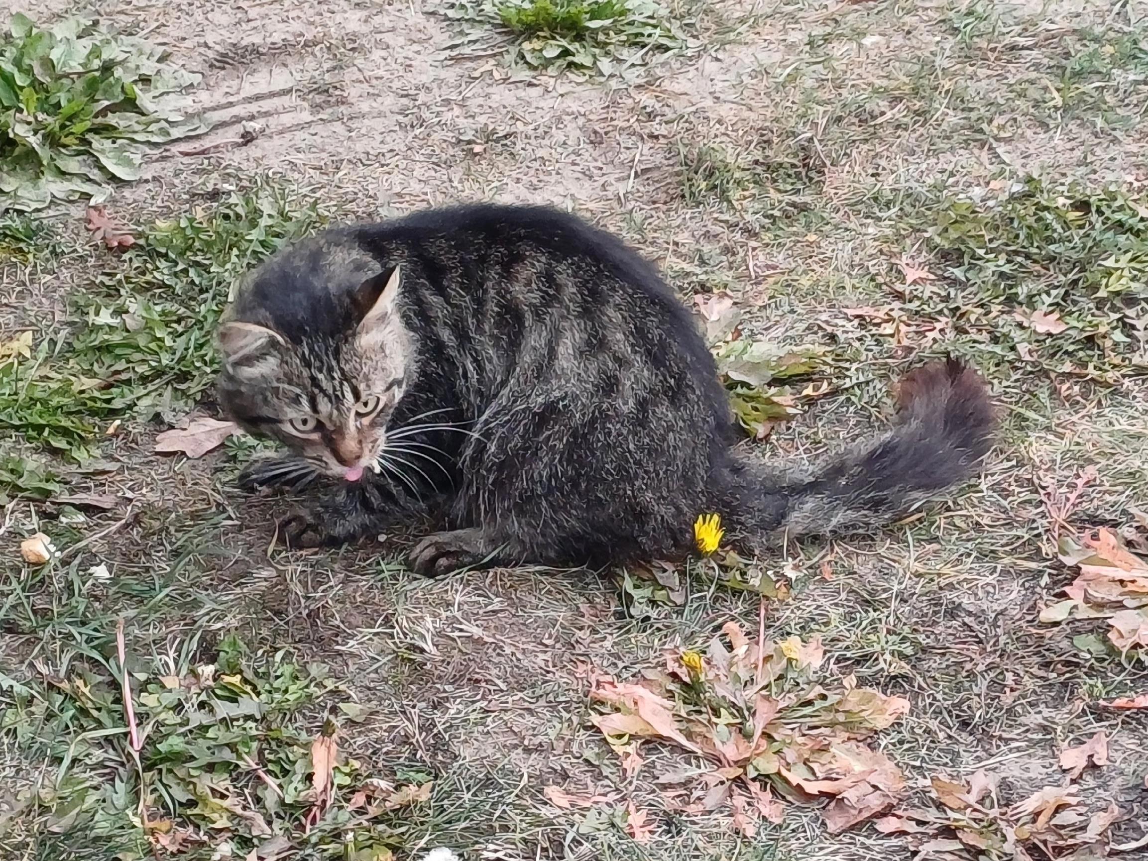 Кстати, обратите внимание - по задницей кота цветущий одуванчик. Цветущий. В конце октября.