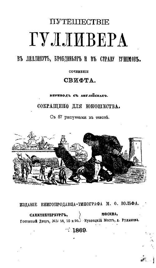 "До сихъ поръ на русскомъ языкѣ не было полнаго перевода классической сатиры Свифта, и потому мы рѣшились познакомить читающую публику съ этимъ міровымъ его произведеніемъ. Путешествія Лемьюэля Гулливера переведены и переводятся на всѣ европейскіе языки, выдерживая десятки изданій. Только русская публика знаетъ Свифта по жалкимъ дѣтскимъ передѣлкамъ, не имѣющимъ ничего общаго съ оригиналомъ, кромѣ ничтожныхъ обрывковъ фабулы, уродующихъ не только характеръ сатиры, но и характеръ всего разсказа, какъ глубоко задуманнаго и цѣльнаго художественнаго произведенія. Намъ кажется, это менѣе всего дѣтская книга".