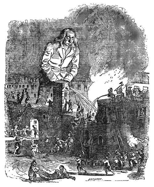 «Пожар начал распространяться, дворец столь великолепный превратился бы неминуемо в пепел, есть ли б по некоторому особливому присутствию разума не выдумал я тот час способа к отвращению такового несчастия. Минувшим вечером пил я очень много белого вина, называемого глимигрим, кое привозится из некоторой Блесфуканской провинции и гонит очень на низ воду, коя до того самого времени, власно как для надобности, отнюдь не делала мне беспокойствия; а тут жар от огня, усилие к утушению оного и находящееся во мне количество вина, власно как соединясь, понудили меня к спущению воды. Пустил я оную в таком великом множестве и намечая столь исправно в те самые места, где надобно, что в три минуты пожар во всем утих. . .»