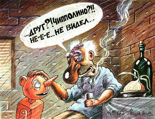 На ночь глядя супружница послала в магаз за луком, благо под боком «5» ночная. Иду на закупку в легкой куртке. У входа в магаз недопитая бутылка газировки «Буратино». Что-то в голове само сложилось – «Лук-куртка-Буратино». Вспоминаю классику: Папа Карло выстругал себе сынка и тут же сообразил, что чадо хочет жрать. Берет куртку, идет на базар и обменивает ее на луковицу. ЕЕ и скармливает новорожденному. Ничего не напрягает? Не молока кувшинчик, не лепешку принес ребенку, а именно – луковицу. Что за куртка такая говенная, что так низко оценена? И догадка -- автор рассказал не все. Карло просто решил прибухнуть и сменял на базаре куртку на вино, которое и потребил вместе с этим… Сизым Носом. А луковица… ну закусь осталась, вот и скормил сынку…