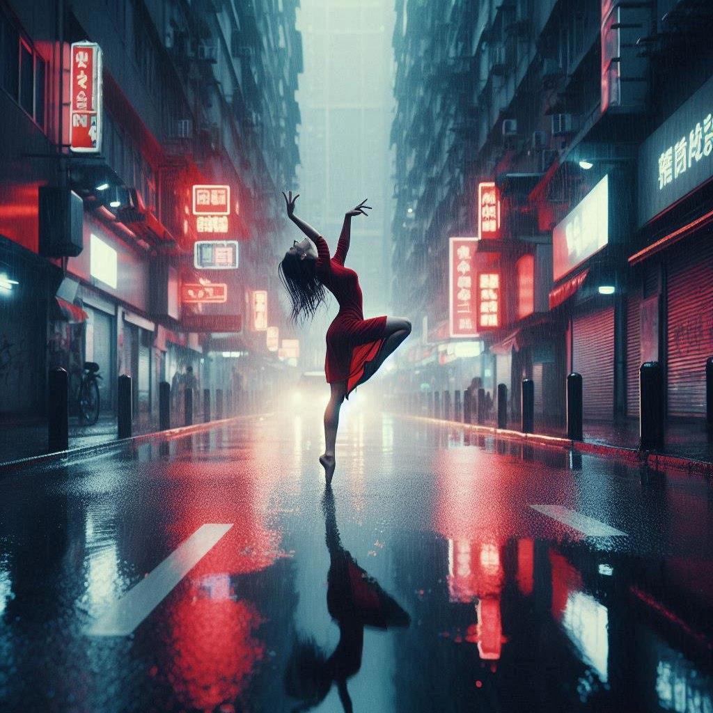 Женщина в красном платье, танцующая под дождём на пустой городской улице, с отражениями неоновых огней в лужах