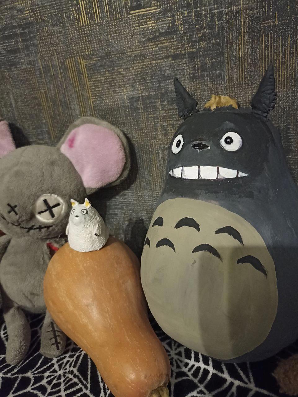 Хожу я, значит, смотрю — в овощных ящиках лежат прелестные маленькие тыквы, все одинаковые, грушевидные. Между тыквами и мной мгновенно возникла эмоциональная связь, я взяла 2 штуки и дальше пошла с ними, понимаете? Прихожу домой и выясняется, что одна из тыкв — явный Тоторо, в гадалке не ходи, стопудовый Тоторо Миядзаки, ещё скажите нет. Вот он, со своим маленьким белым спутником: