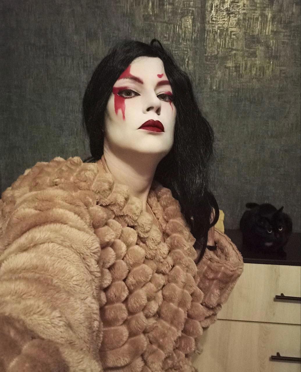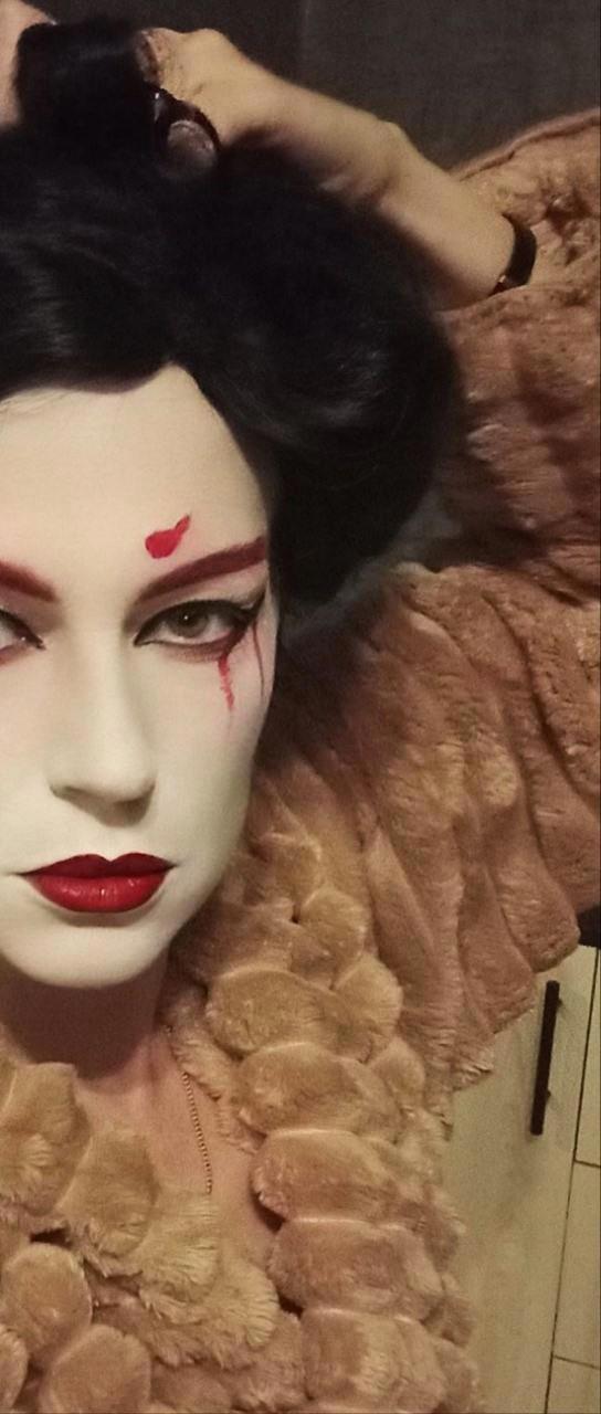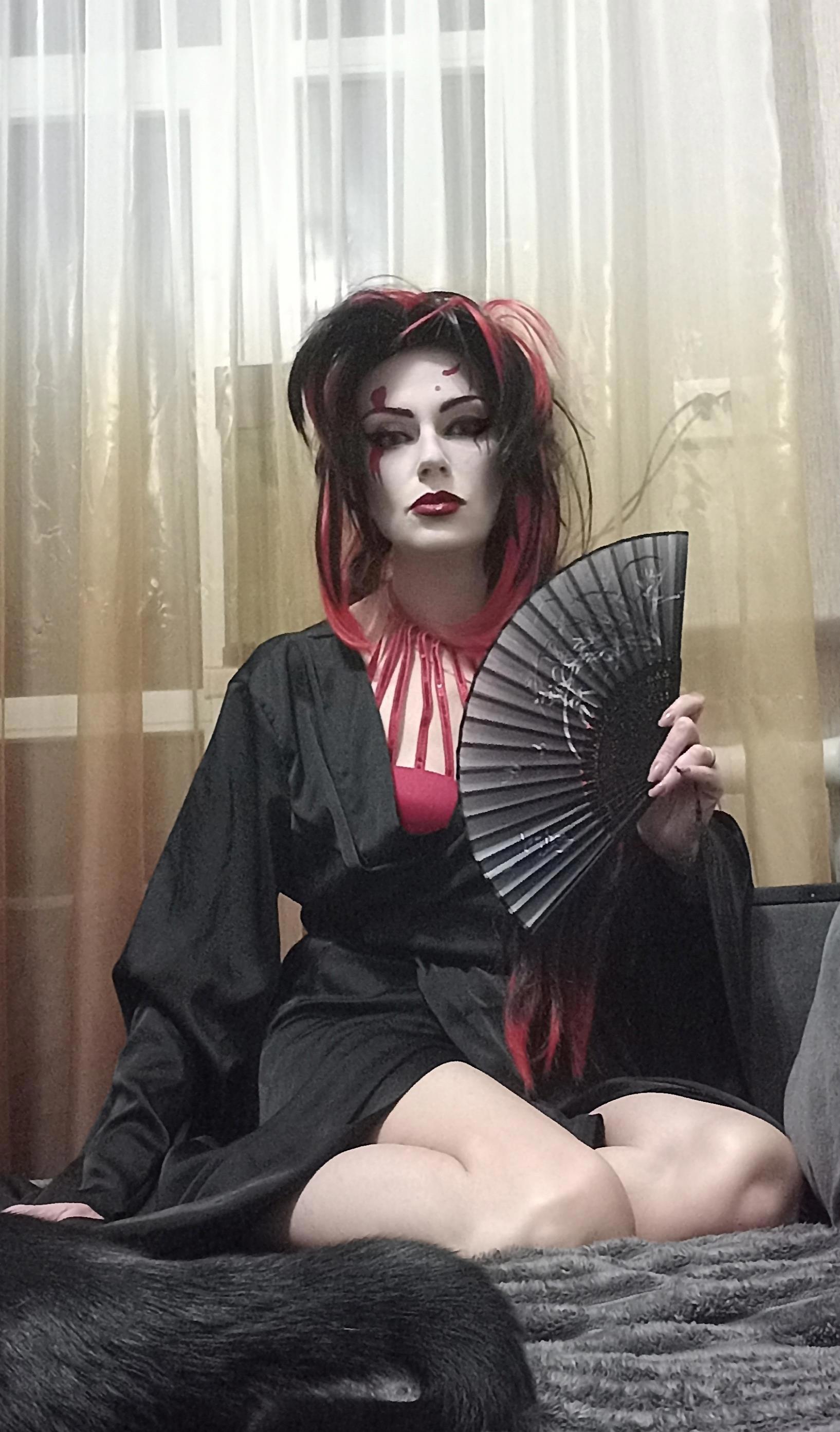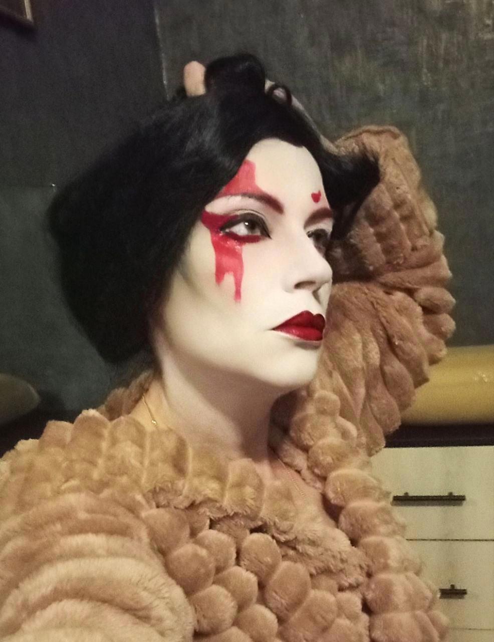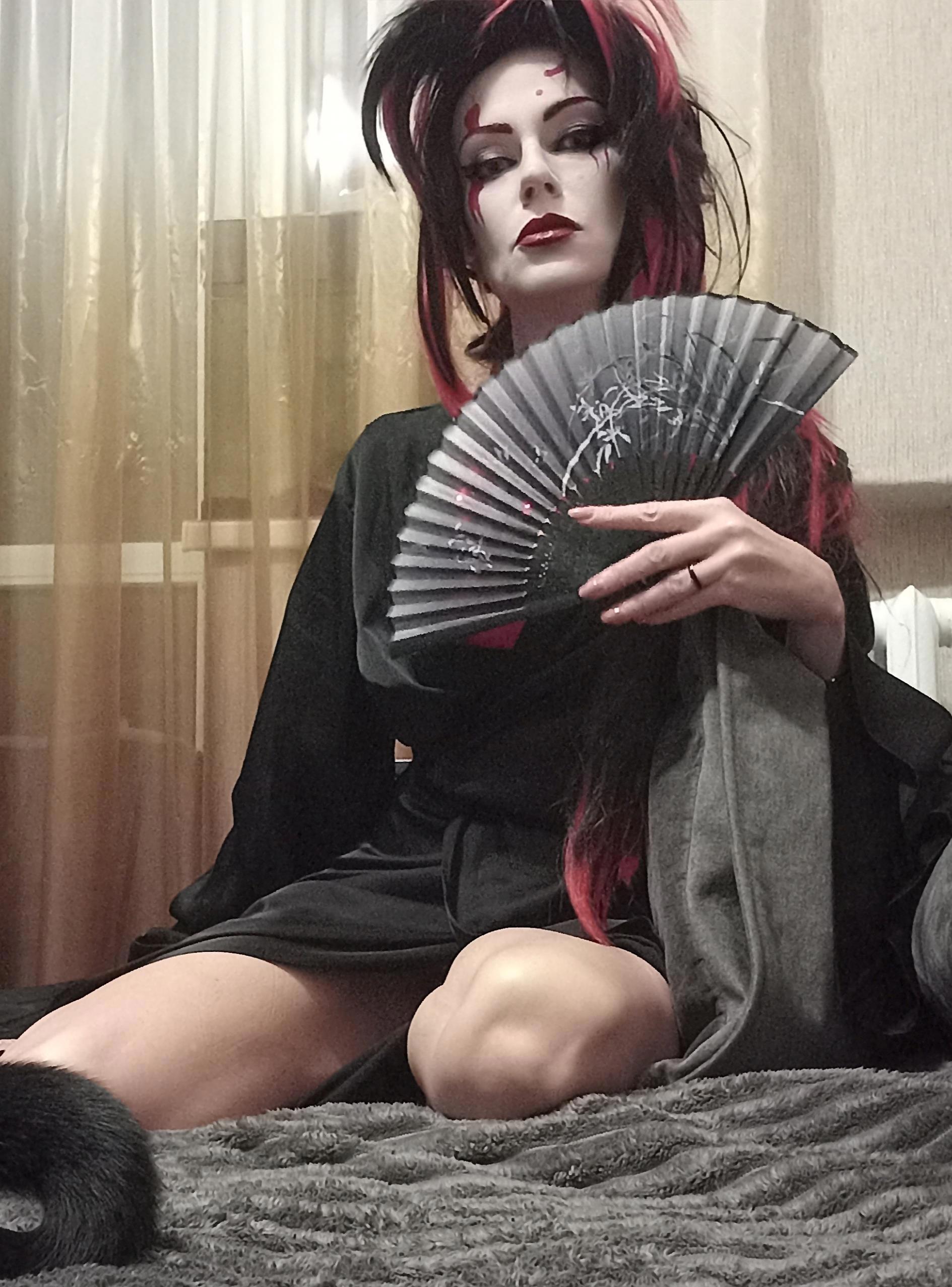Вроде сделала всё как на картинке в интернете, но вижу несоответствие образу, дело плохо, черты лица совсем не японские хоть ты тресни, хоть пополам разорвись, хоть с ног до головы разрисуйся. Нужно было что-то предпринять и я заказала на алике новый парик, веер и настоящее кимоно, из которых первые два приехали, а за кимоно внезапно вернули деньги и теперь его нету, а так бы было и лежало в антресоли. Но!!! У меня есть халат-кимоно, я в нём живу, когда не слишком холодно или жарко. Я решила юзать халат, чем-нибудь закрыв излишне голые места, и вот тут мы вплотную подобрались к анекдоту, понимаете? Потому что японская лиса получилась так себе, зато «папа, папа, я бля-а-адь…» — вполне себе вышла, извините.