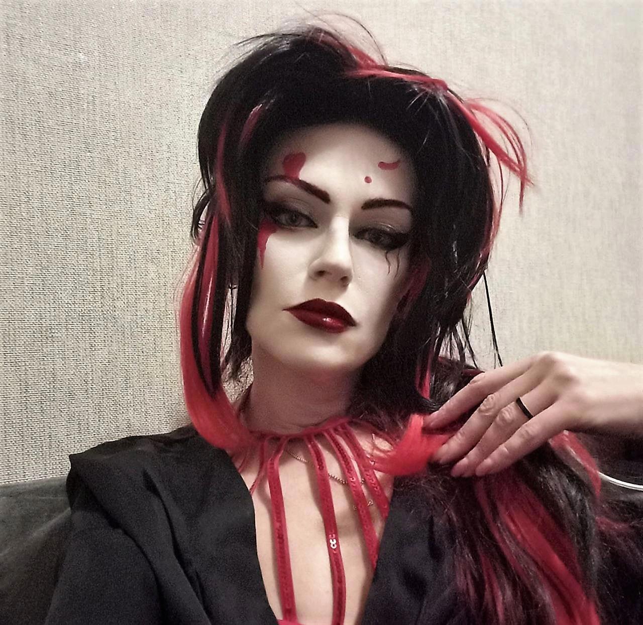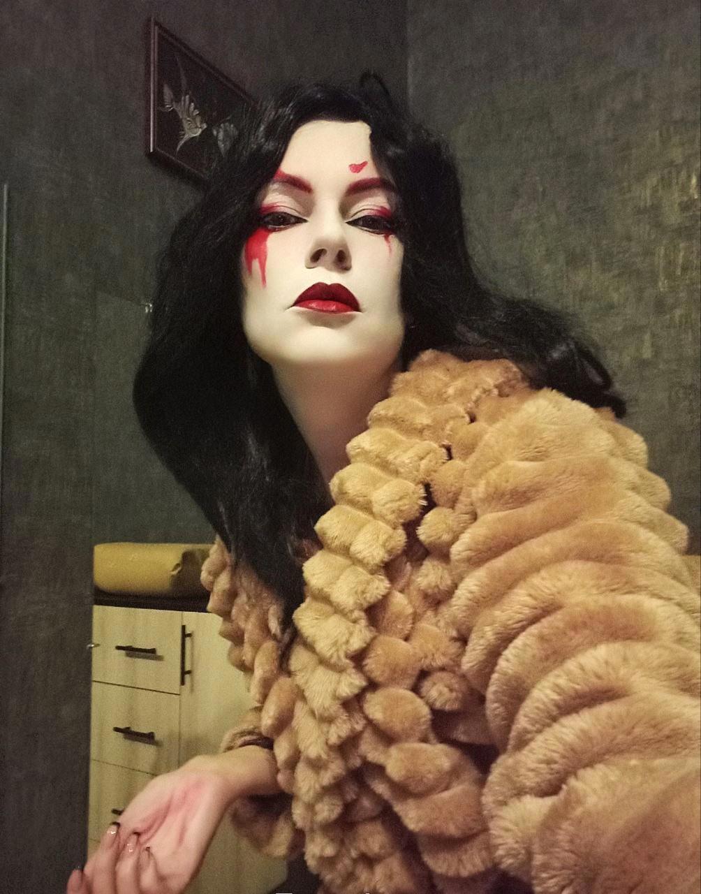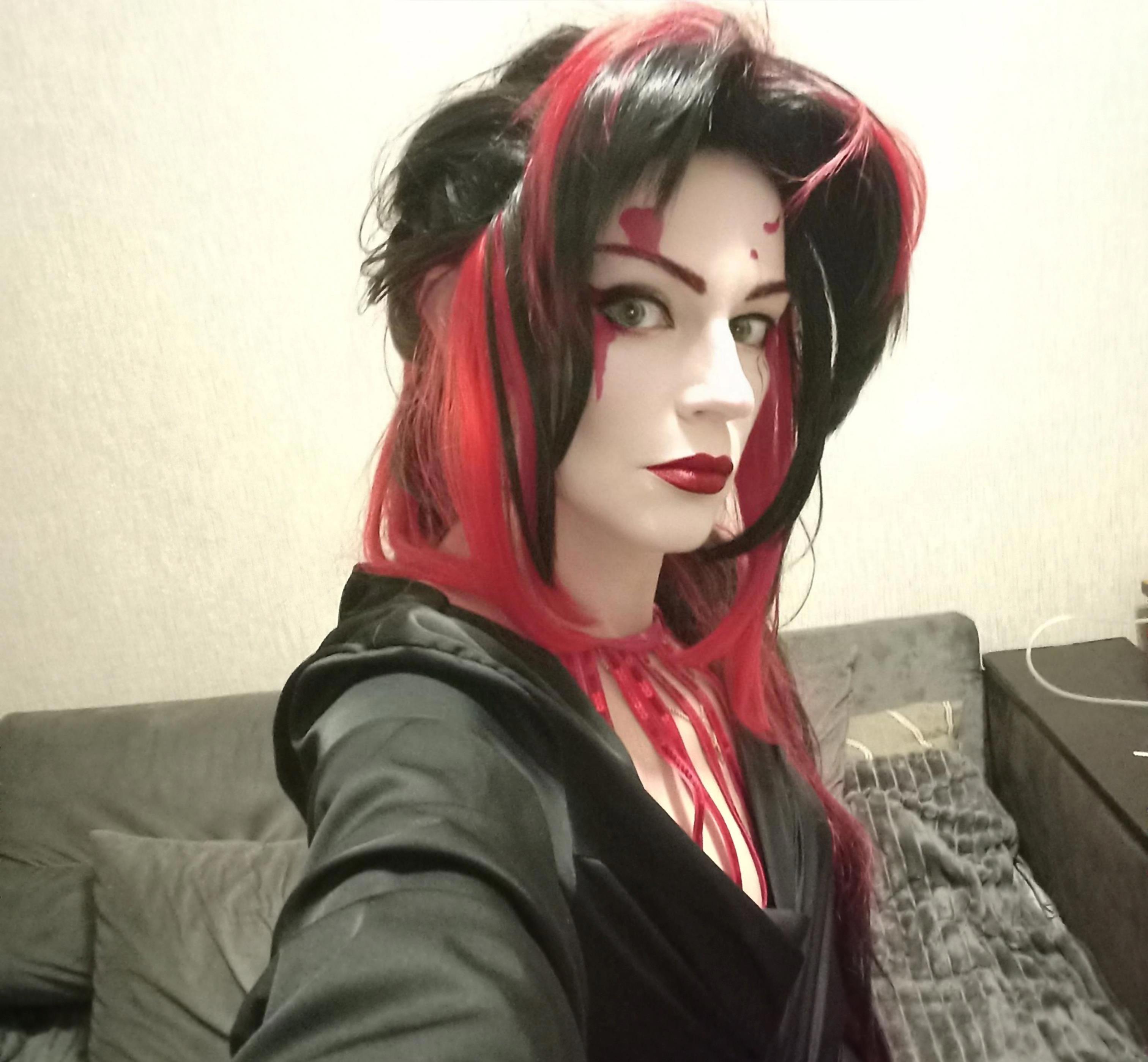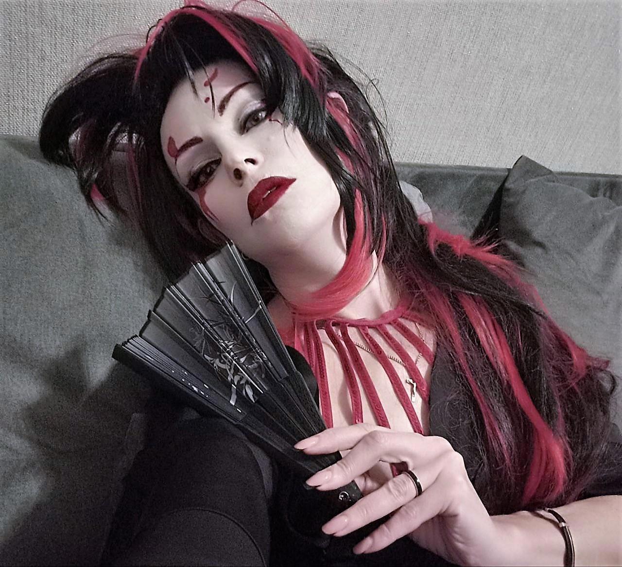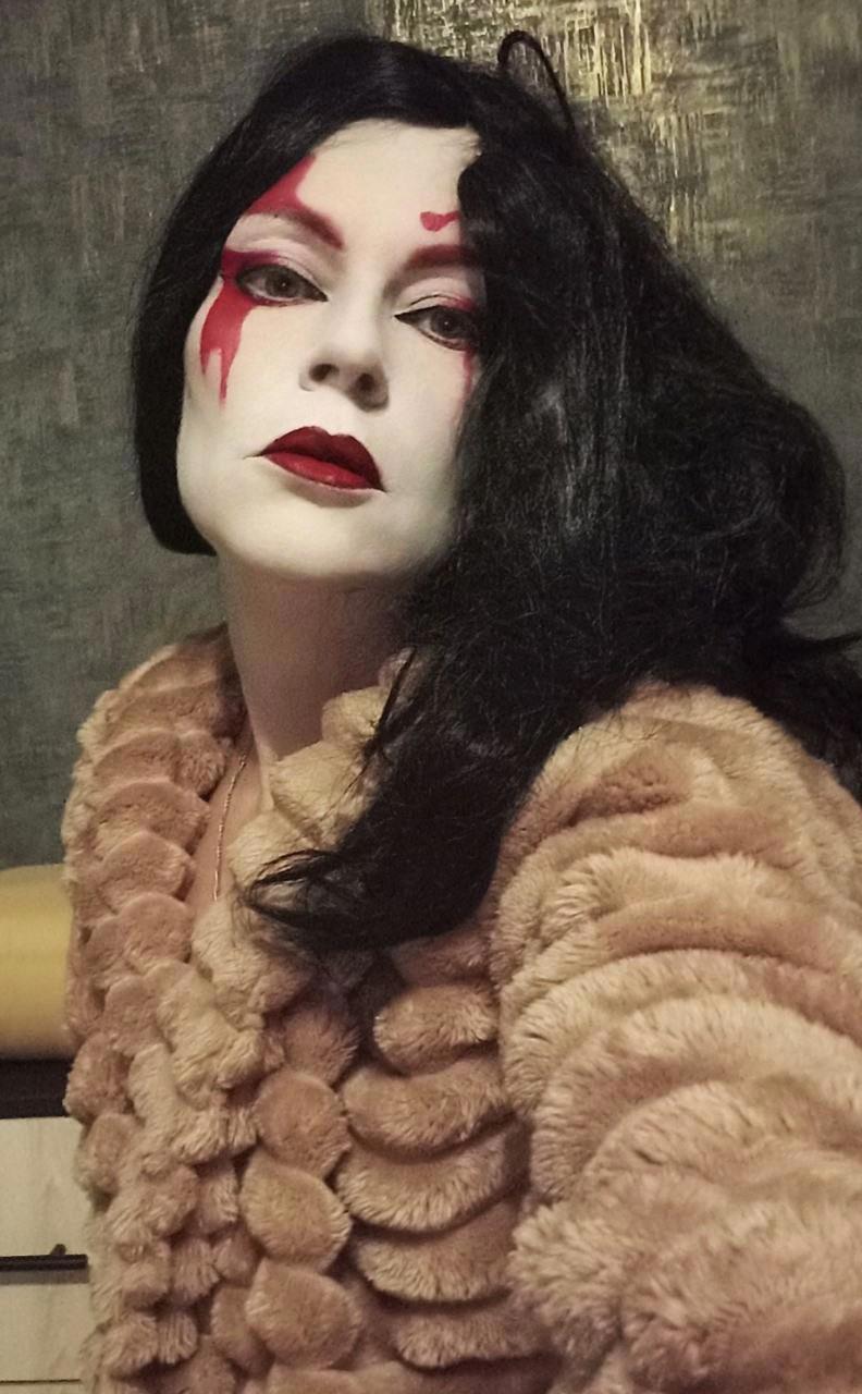 Вроде сделала всё как на картинке в интернете, но вижу несоответствие образу, дело плохо, черты лица совсем не японские хоть ты тресни, хоть пополам разорвись, хоть с ног до головы разрисуйся. Нужно было что-то предпринять и я заказала на алике новый парик, веер и настоящее кимоно, из которых первые два приехали, а за кимоно внезапно вернули деньги и теперь его нету, а так бы было и лежало в антресоли. Но!!! У меня есть халат-кимоно, я в нём живу, когда не слишком холодно или жарко. Я решила юзать халат, чем-нибудь закрыв излишне голые места, и вот тут мы вплотную подобрались к анекдоту, понимаете? Потому что японская лиса получилась так себе, зато «папа, папа, я бля-а-адь…» — вполне себе вышла, извините.