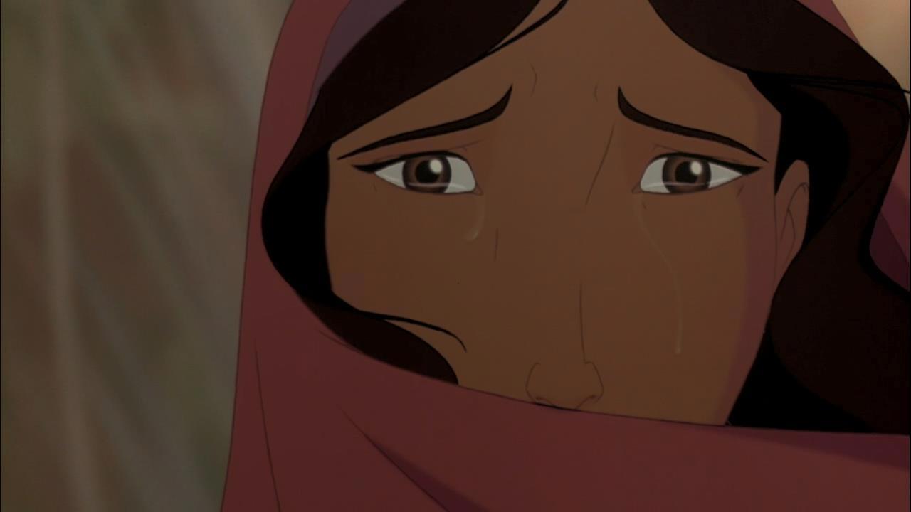 В следующем кадре мы видим еврейский, видимо, поселок трущобного вида, прилепившийся к стенам египетского города. Пока мужчины на стройке, в городке остаются одни женщины и дети (и то не особо много). В городе египетские солдаты. А мы видим семью из женщины с тремя детьми: это Иохаведа, Аарон, Мириам и новорожденный Моисей.