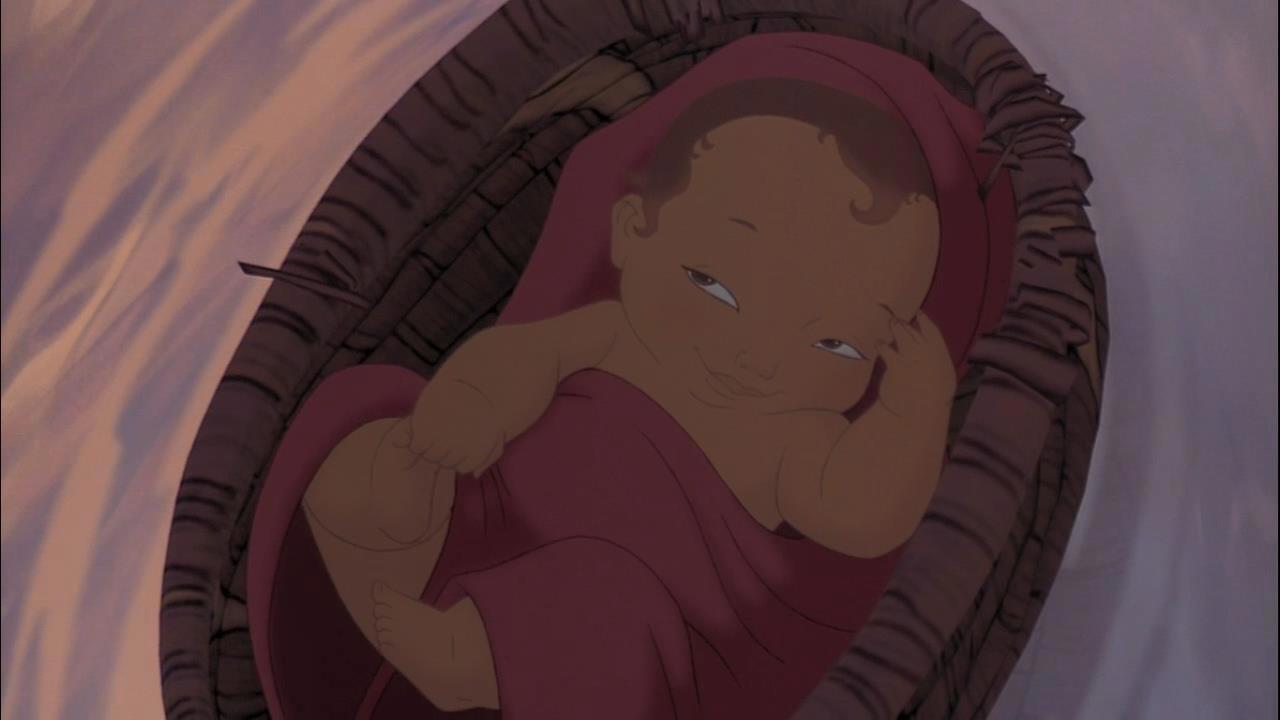 Корзинка, чудом преодолев ряд опасностей, заплывает в уединенное место для купания семьи фараона, где растут тростник и водяные лилии, плавают ибисы и вообще красиво. Там корзинку находит жена (а не дочь, как в Библии) фараона, которая купалась со своим маленьким сыном Рамзесом.