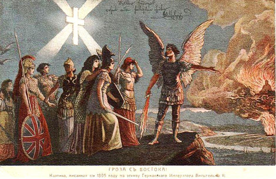 Я легко узнал Великобританию, Россию, Францию и Пруссию. Даже без предыстории и минимальном знании военной истории нетрудно догадаться, что архангел предостерегает от угрозы китайской орды.