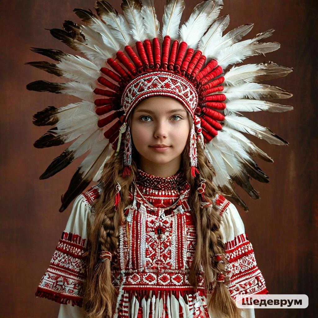 Ну и последняя иллюстрация с Шедеврума практически дословно: "женщина в национальном костюме-сарафане с вышитыми орнаментами красным по белому". Или головной убор идейцев северной Амереки совместить с национальным платьем жительницы центральной Европы.