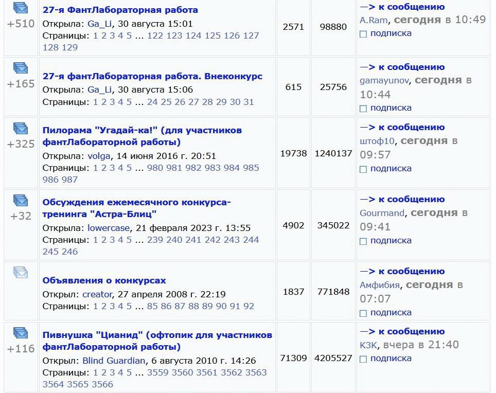 Ну все эти +510, +165, +325, +116 и даже +32. Для тех, кто незнаком с интерфейсом сайта «Лаборатория Фантастики», поясню: плюсики и число после них обозначают количество новых сообщений в теме форума. И, конечно же, мне были интересны не столько новые сообщения, сколько сами темы.