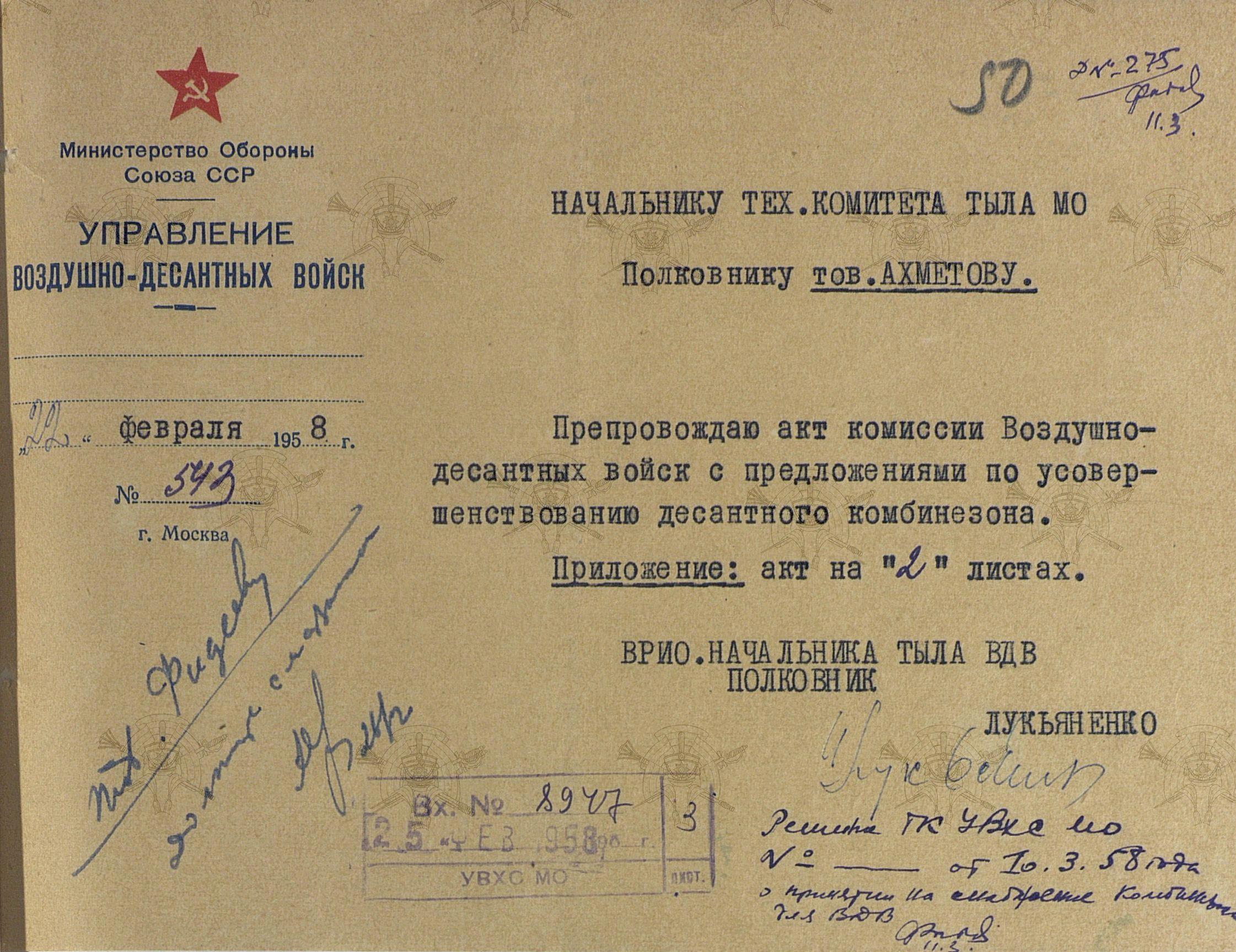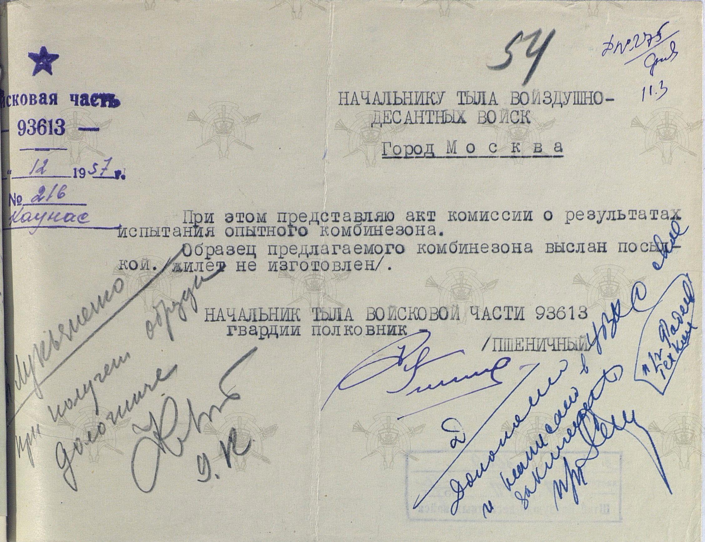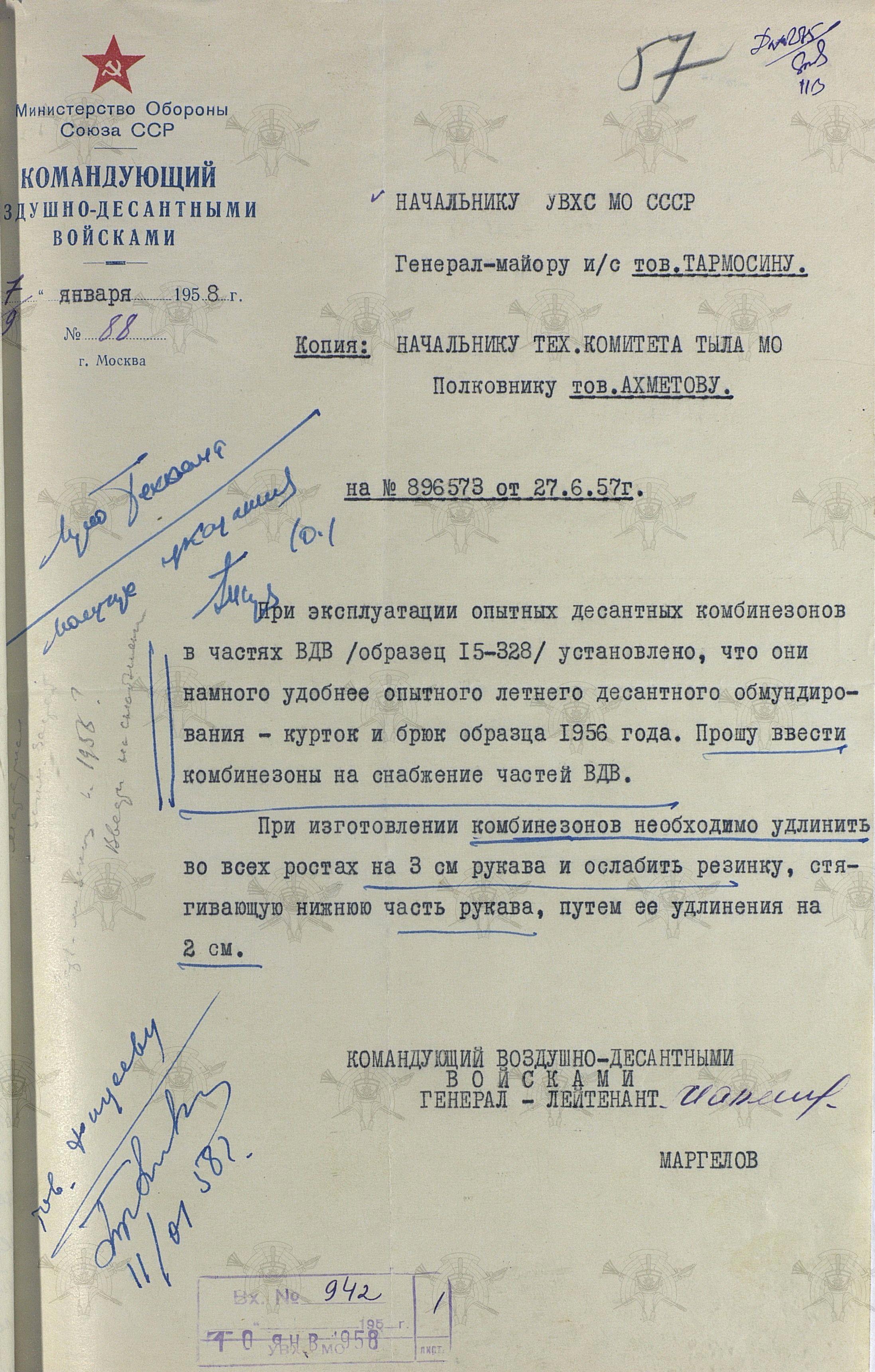 7 января 1958 г., Командующий Воздушно-десантными войсками генерал-лейтенант Василий Филиппович Маргелов направляет начальнику Управления вещевого и хозяйственного снабжения МО СССР генерал-майору и/с Филиппу Григорьевичу Тармосину письмо, с информацией о завершении испытаний опытных десантных комбинезонов.