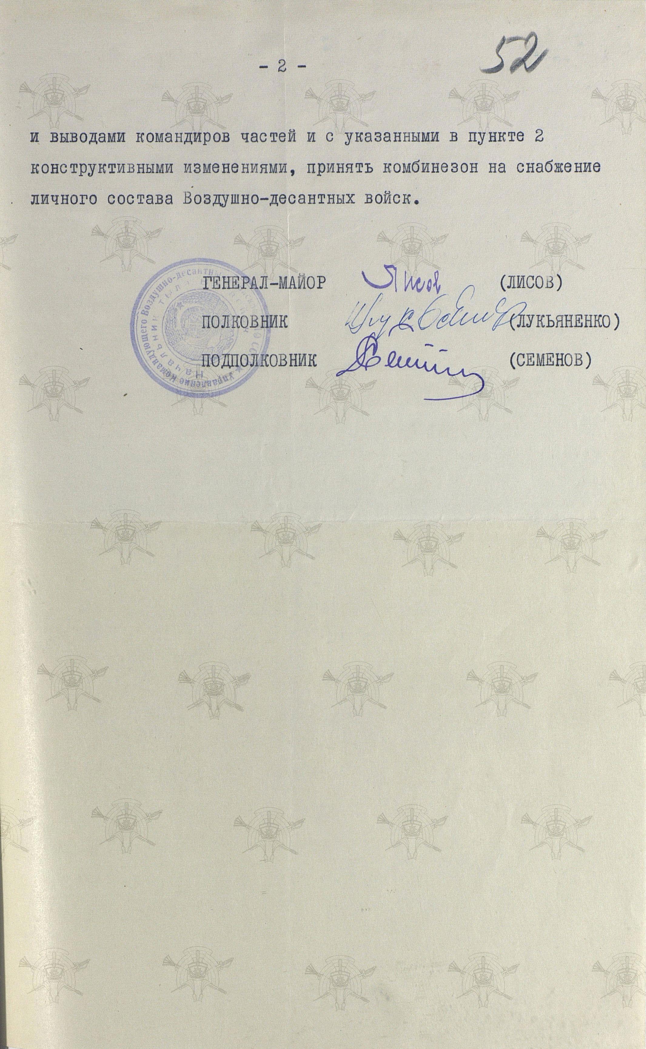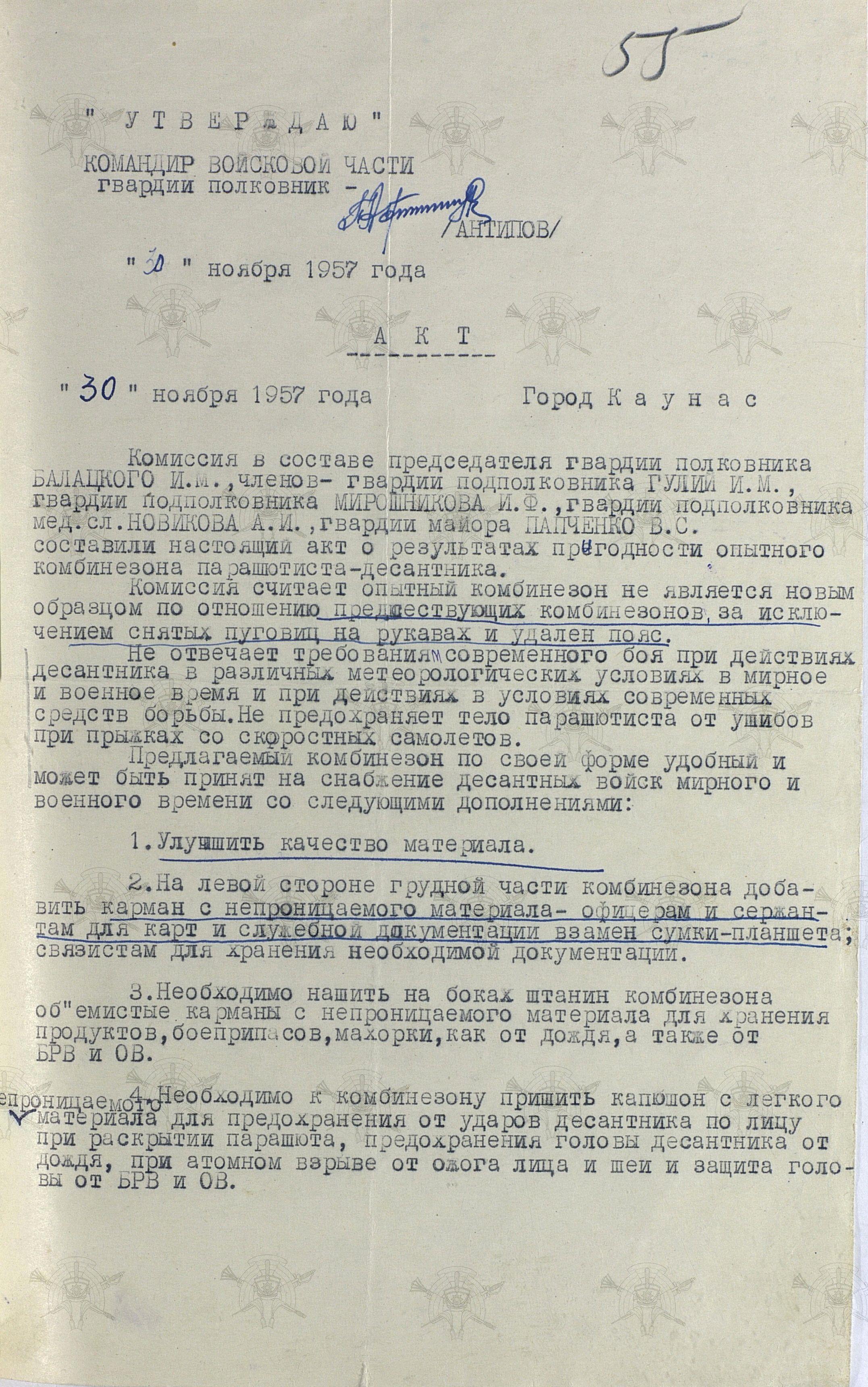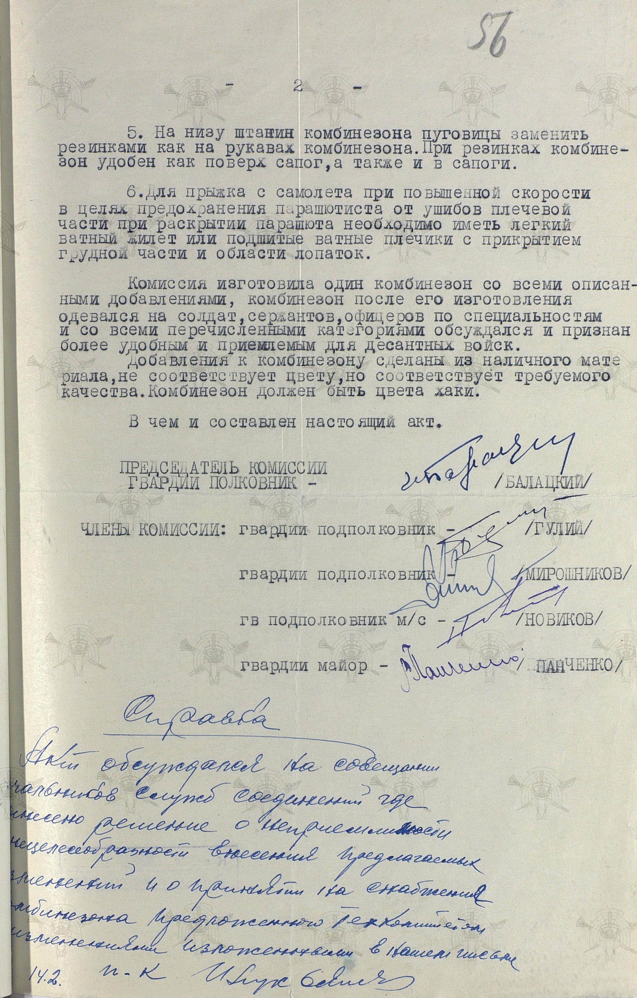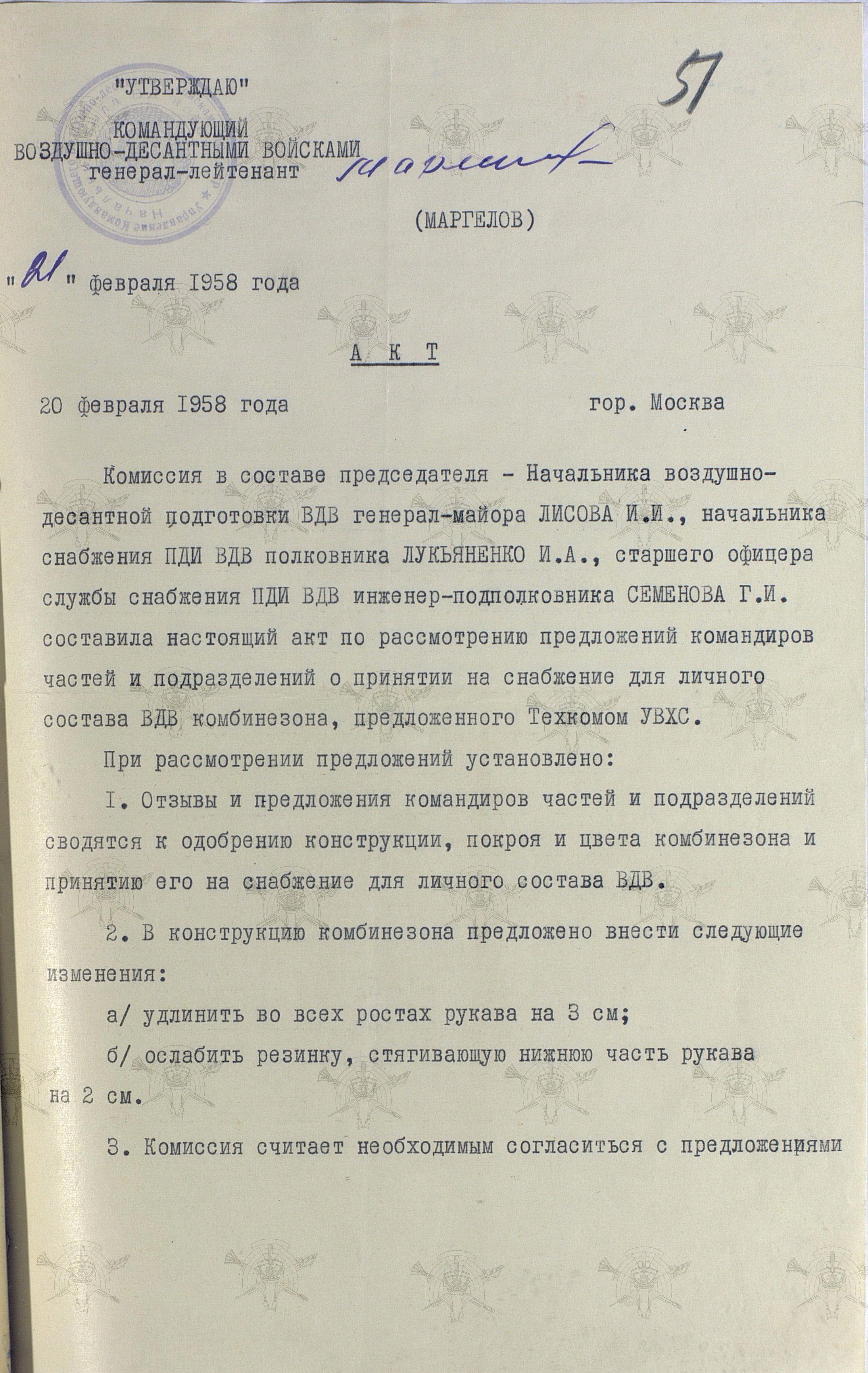 7 января 1958 г., Командующий Воздушно-десантными войсками генерал-лейтенант Василий Филиппович Маргелов направляет начальнику Управления вещевого и хозяйственного снабжения МО СССР генерал-майору и/с Филиппу Григорьевичу Тармосину письмо, с информацией о завершении испытаний опытных десантных комбинезонов.