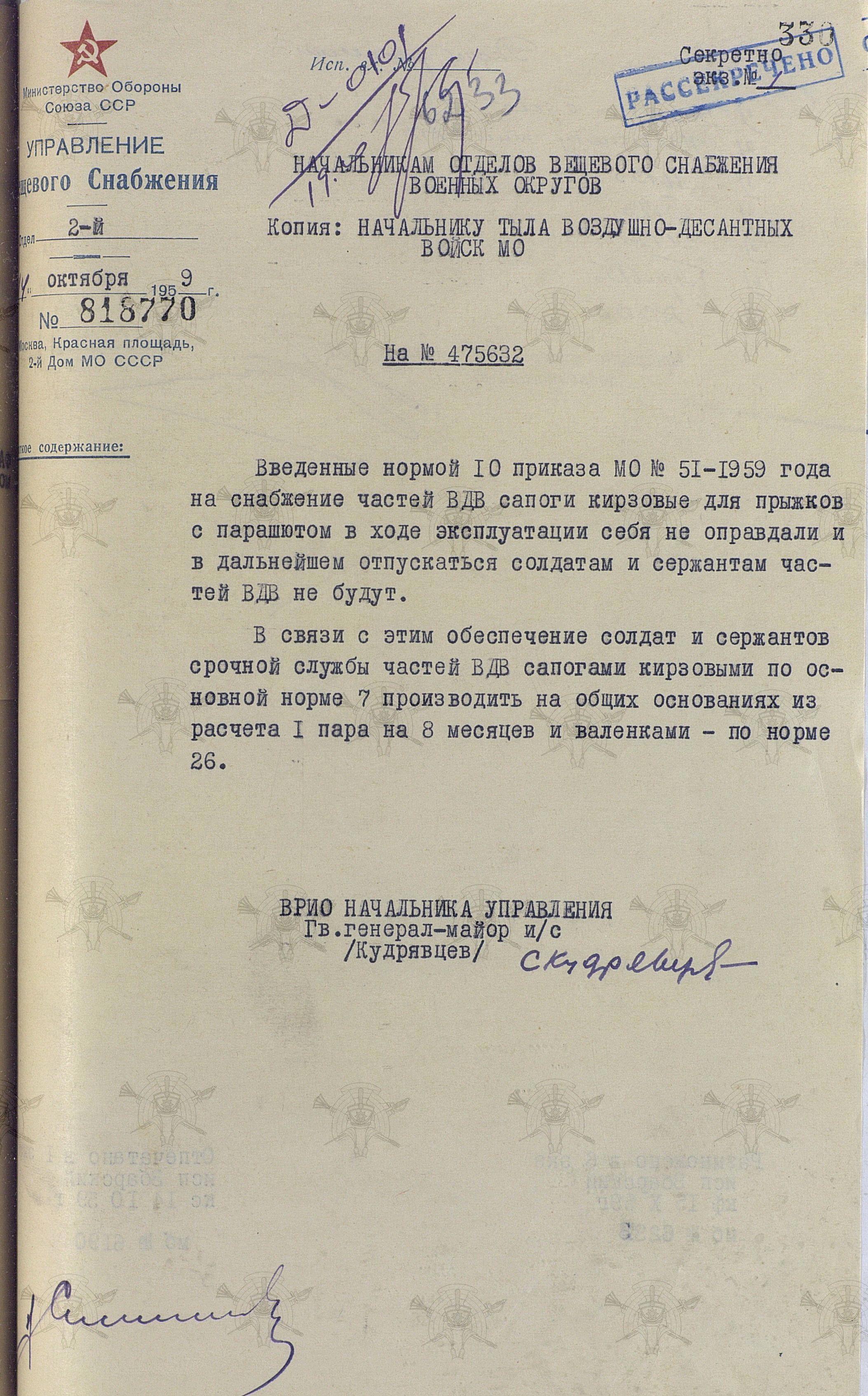 Обмундирование для ВДВ СССР в 1959 г. Переписка по улучшению снабжения