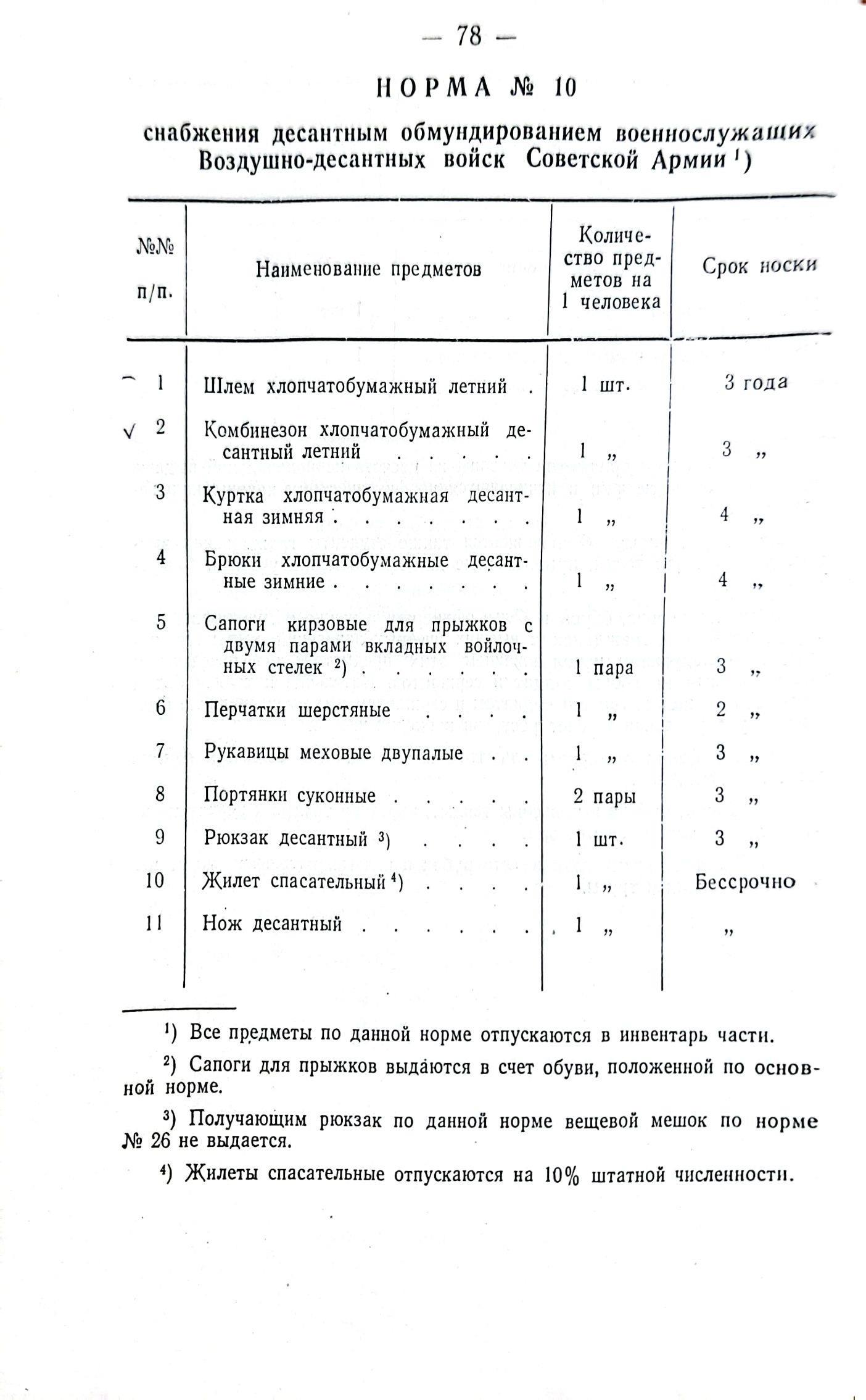 Видите, пункт 5 и примечание к нему? То есть, сапоги кирзовые для прыжков, выдаваемые военнослужащим ВДВ, шли взамен обуви, выдаваемой по основным нормам, №№ 7 и 8 (для военнослужащих с 3-х и 2-х годичным сроком службы), и если уж точно следовать букве приказа – то ещё сержантам, ефрейторам и рядовым сверхсрочной службы.