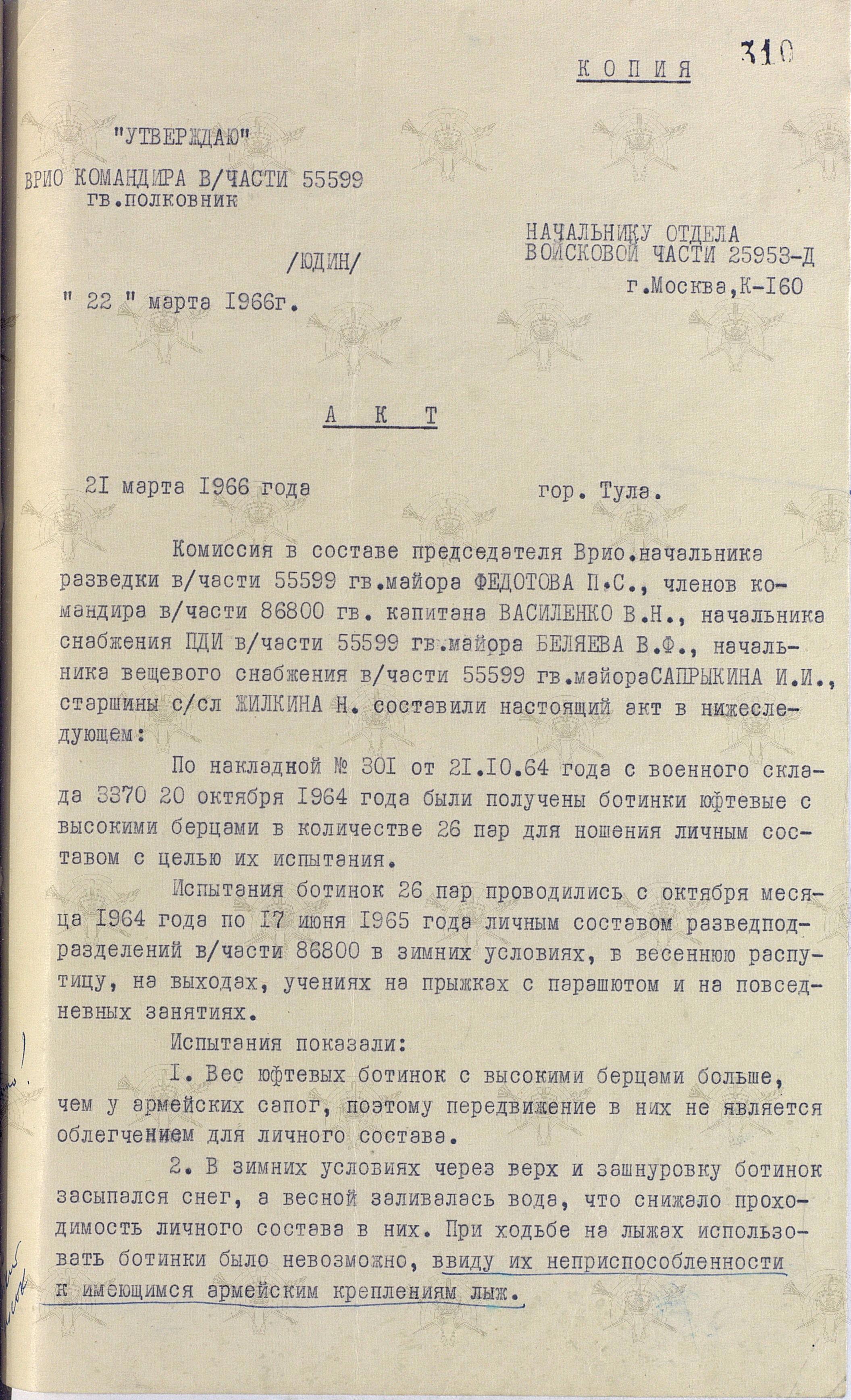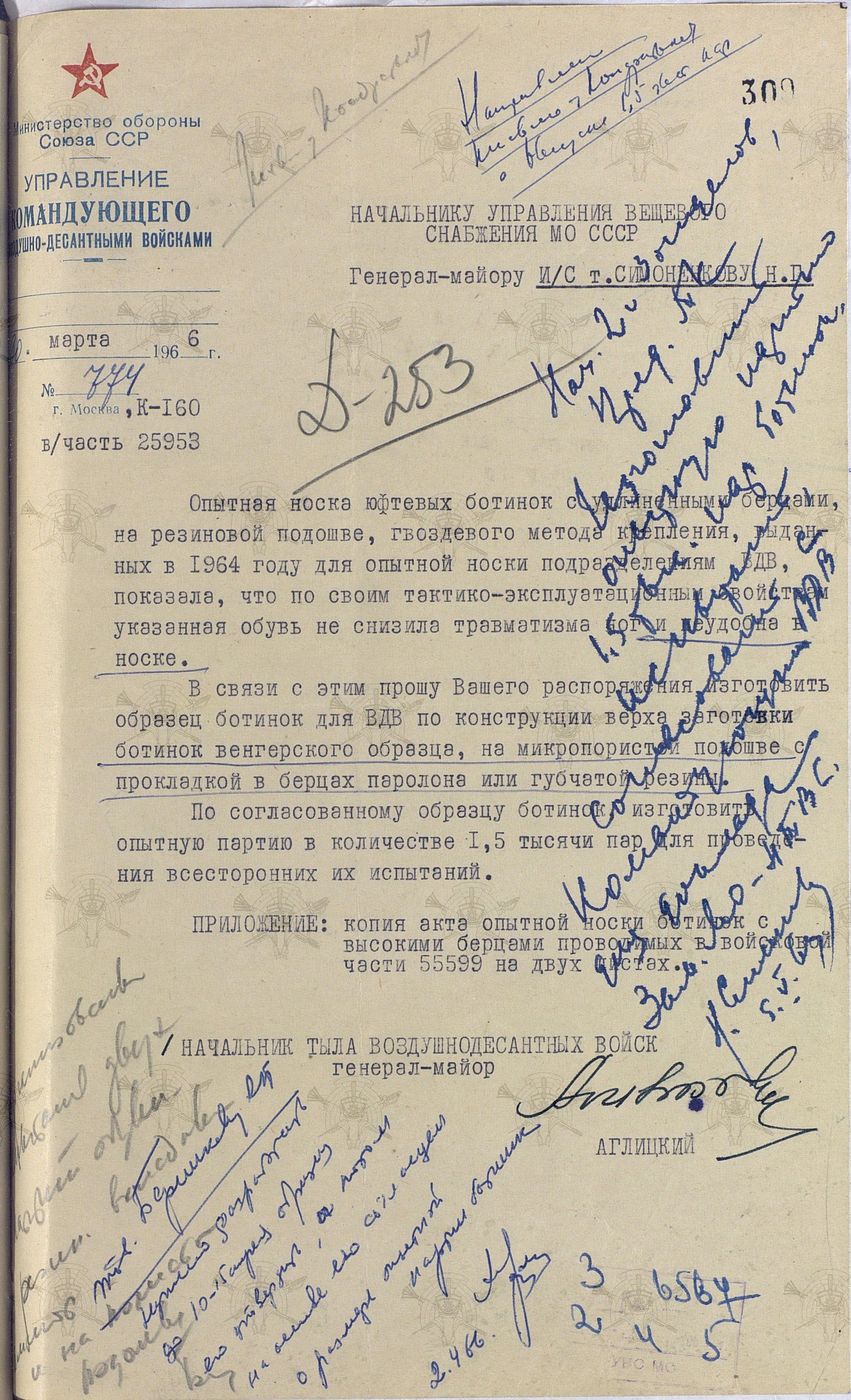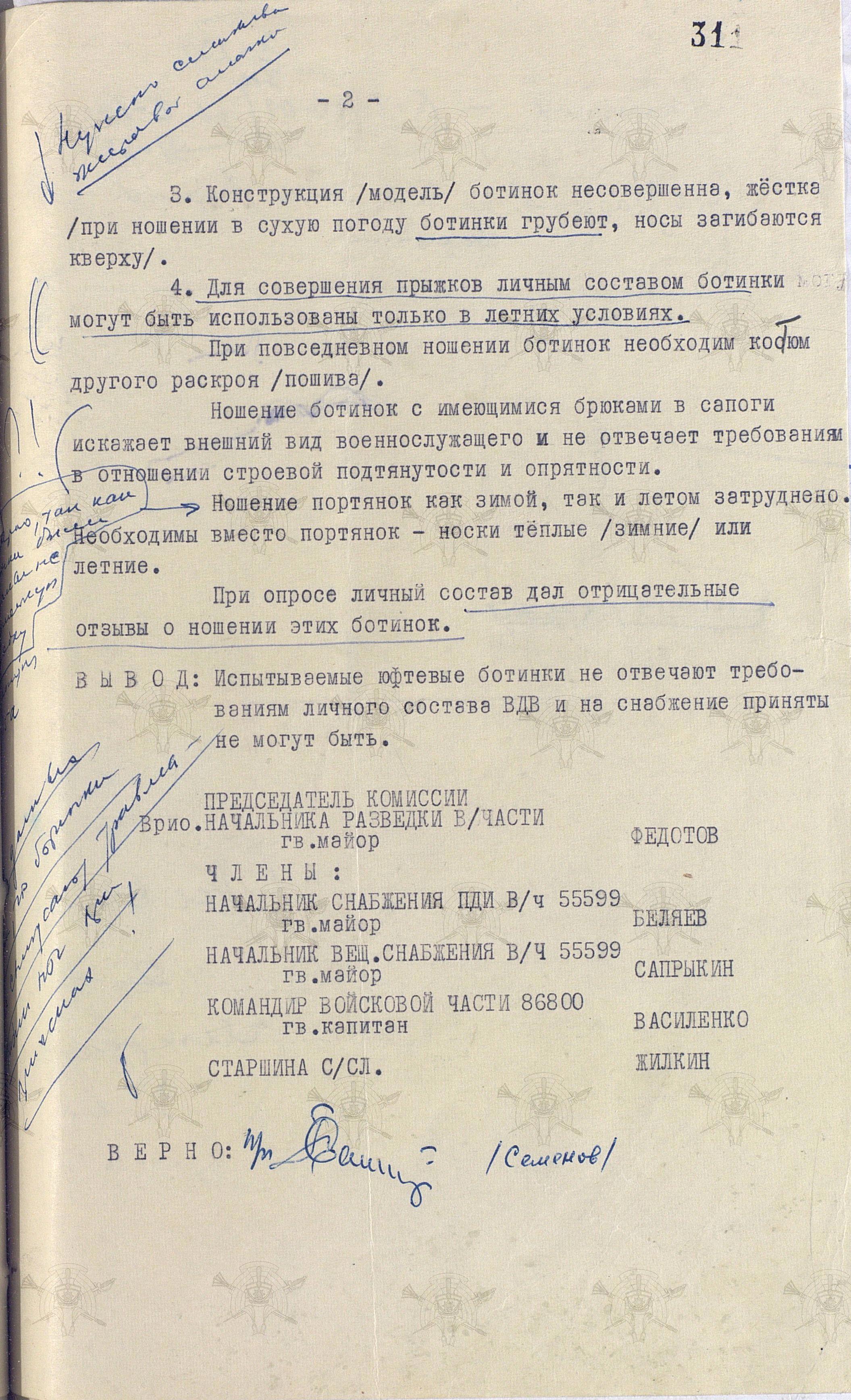 А теперь почитаем документ о результатах опытной носки ботинок с высокими берцами военнослужащими 106-й гвардейской воздушно-десантной Тульской Краснознамённой, ордена Кутузова дивизии. Каюсь, резолюции руководителей как ни старался, но разобрать так и не смог. Думаю, примерный их тон понятен.