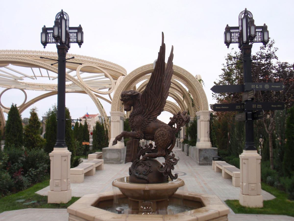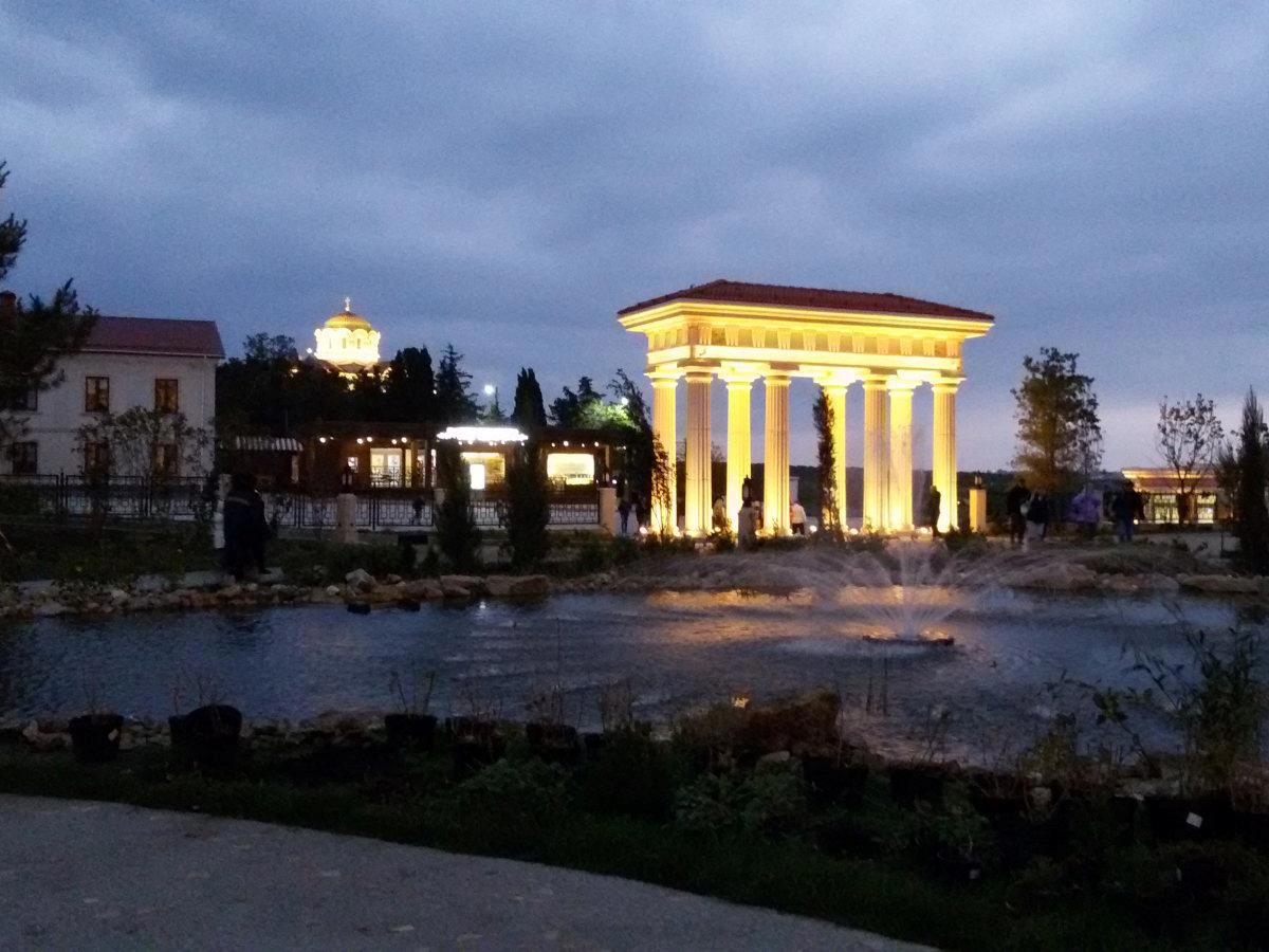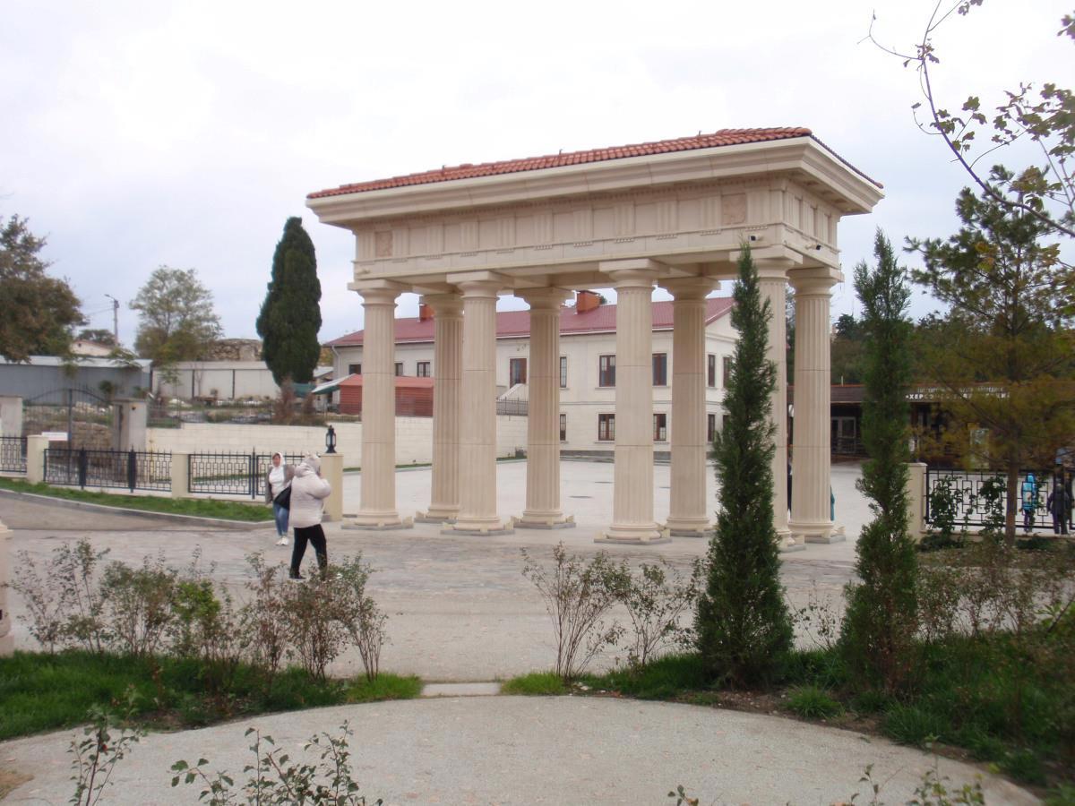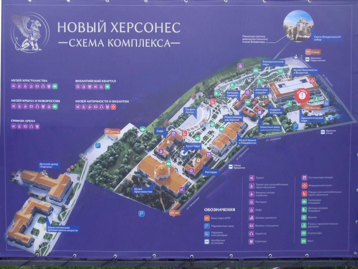 В "Новом Херсонесе" каждый найдёт то, что ему близко. Вход в него бесплатный; через символические ворота можно перейти в "Старый Херсонес". Внутри реализовано три пространства, посвященные Античности и Византии, христианству, а также Крыму и Новороссии. Нашли свои места кафе, два турцентра, амфитеатр "Грифон-арена", храм-парк, паломнический центр, ЗАГС, сувенирные лавки, ремесленный квартал, школа искусств, детские игровые зоны, отель, в плане проведение спектаклей, концертов и исторических шествий. Вечером на "Грифон-арене" крутят фильмы, в наш приезд был "Берегись автомобиля".