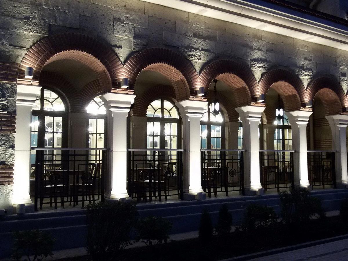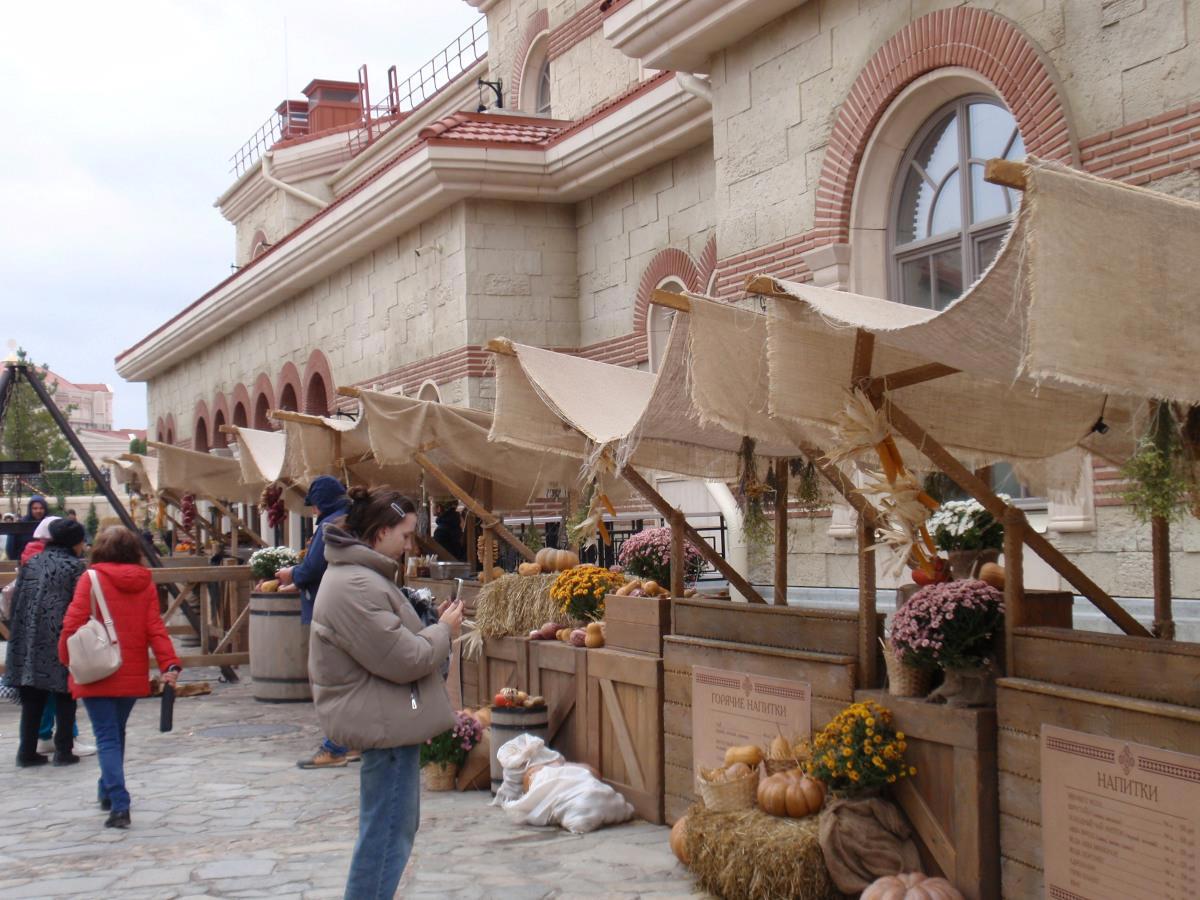 В ремесленном квартале на площади разместили столы, чтобы желающие могли покушать не в стенах кафе (ценник там ожидаемо завышен, но кухня хорошая), а на свежем воздухе. Тут же фастфуд, шашлыки в гигантской подвесной жаровне, свежий хлеб, горячие напитки и прочие прелести.