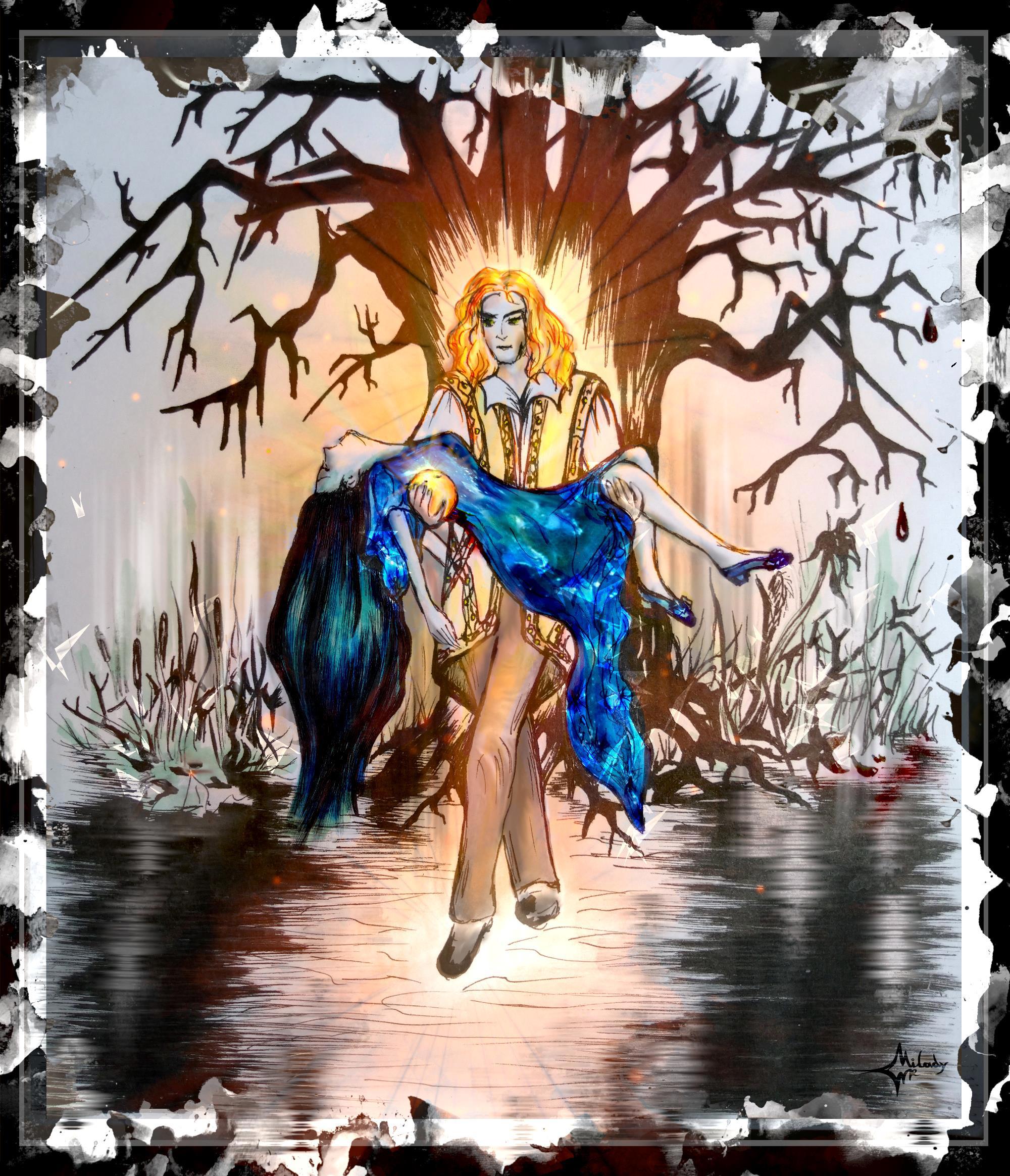 Король Арансио подобрал с земли второй апельсин и пошёл, прямо по воде, к черной магнолии. Матео показалось, что светящийся мужчина, словно невесомый, скользит по поверхности пруда. Король осторожно снял раненую фею с дерева, подхватил на руки и вернулся, также легко ступая по воде, как будто в этом не было ничего необычного. От сияния Арансио на темной глади пруда появилась светлая дорожка.