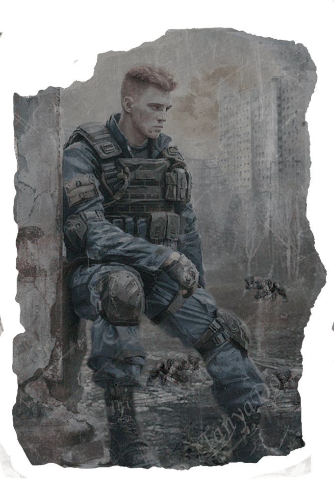 Внешность: Высокий парень с яркими рыжими волосами и веснушками на лице. У него выразительные зеленые глаза и крепкое телосложение. Одевается он обычно в удобную, практичную одежду, в Зоне носит форму наёмников.