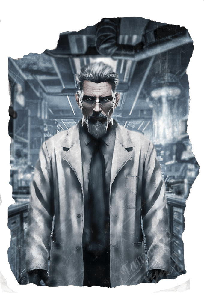 Внешность: Худощавый мужчина с седыми волосами, аккуратно подстриженными, и острой бородкой. Носит очки. Глаза блестят интеллектом и любопытством, а иногда и легким сумасшествием. Чаще всего облачён в комбинезоне учёных или белый халат.