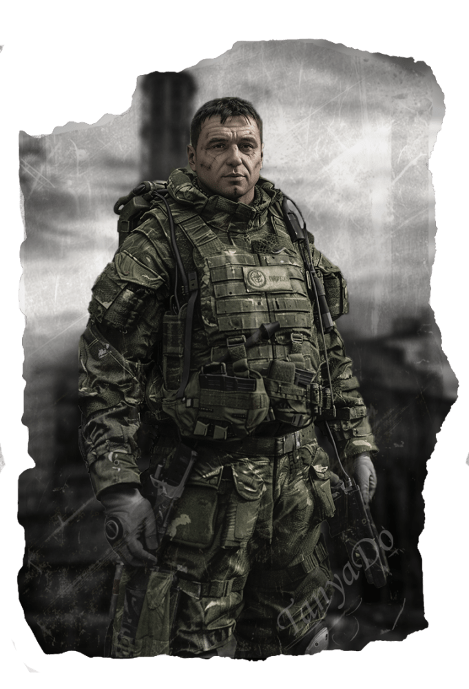 Внешность: Крепкий мужчина, рост 180 см, короткие темные волосы с лёгкой сединой. Темные глаза, щетина. Одевается в прочную камуфляжную одежду.