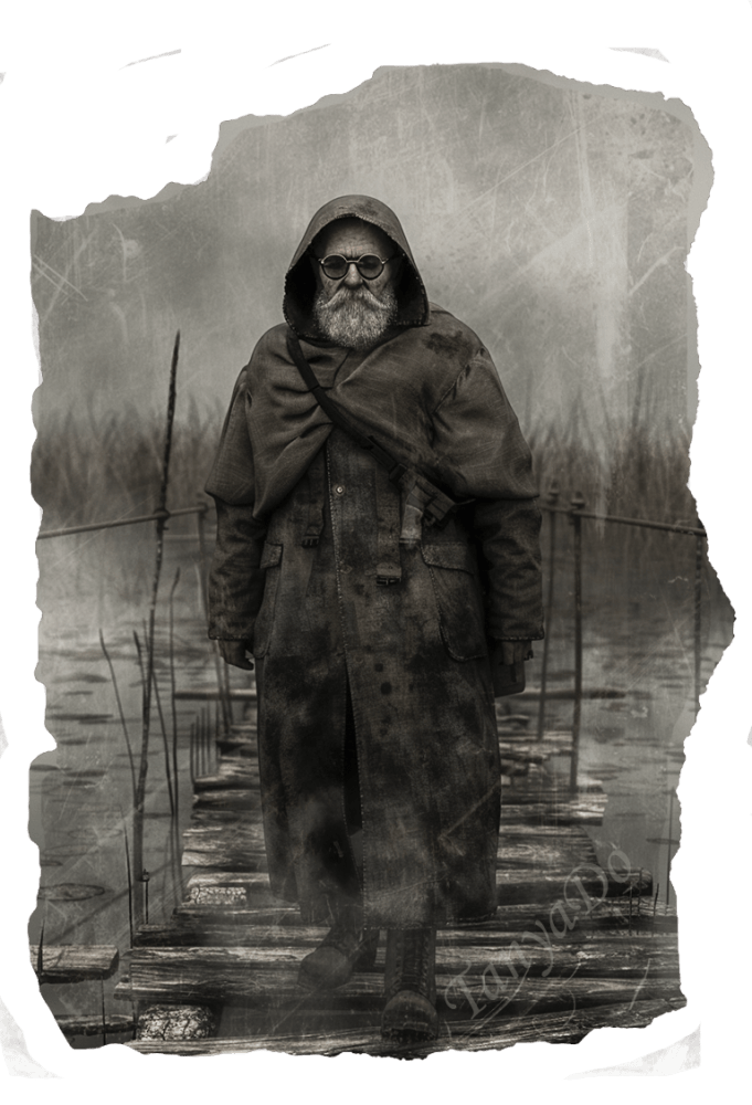 Внешность: Высокий слегка полноватый мужчина. Седой, с аккуратной бородой, в круглых очках. Носит длинный брезентовый плащ, горку и двустволку.