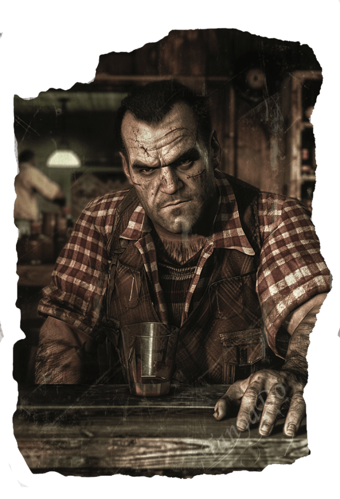 Внешность: Высокий, крепкий мужчина, одет в рубашку и жилет. Хмурый неулыбчивый взгляд, мускулистые руки.
