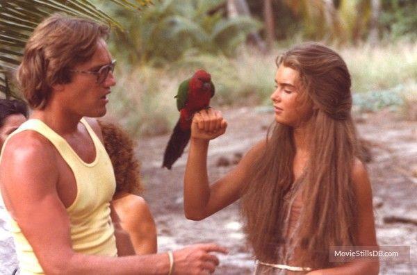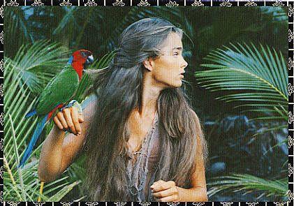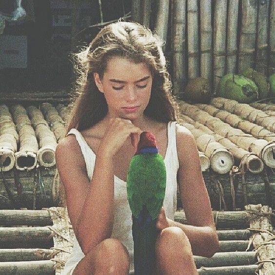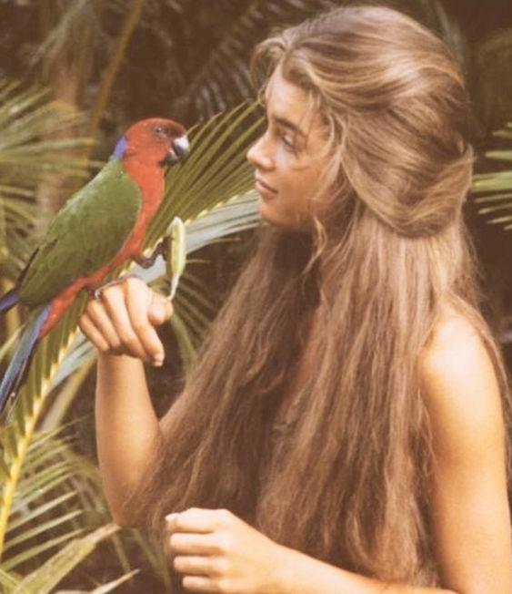 Брук Шилдс общается с попугаем во время съемок фильма "Голубая Лагуна".