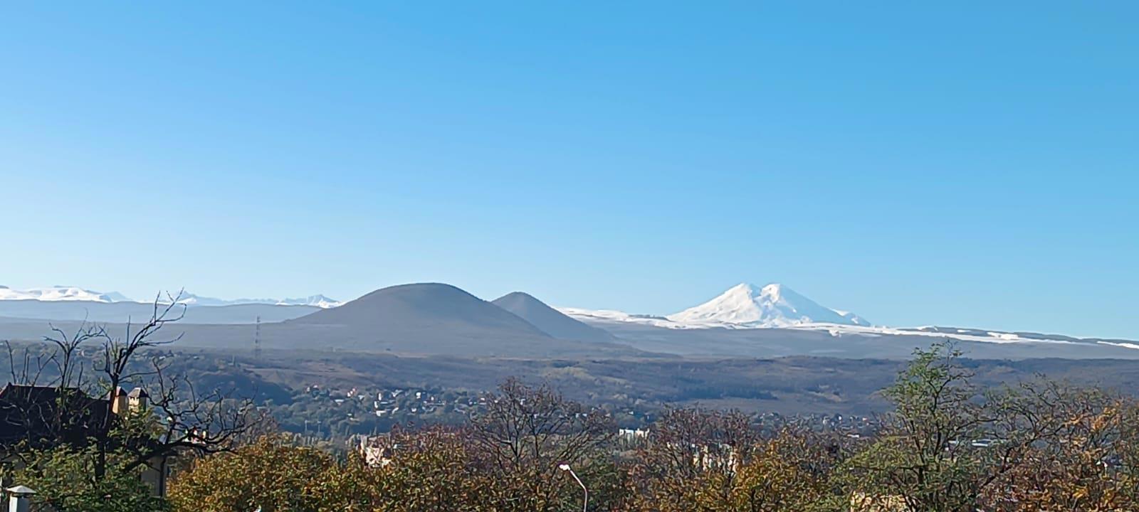 Ну и Эльбрус с утра в окно! Возвышается наш красавец, радует глаз. И несмотря на то, что за бортом +18, предгорье уже все в снегу. Уже сравнялось с Эльбрусом, который и зимой и летом одним цветом...