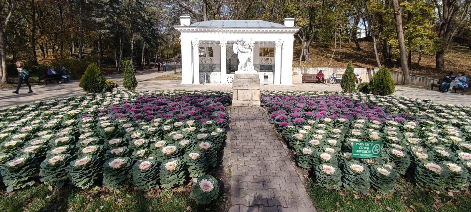 Вчера гуляли в Курортном парке Ессентуков и увидели вот такое оформление у уже недействующего бювета. Там стоит скульптура с ангелочками, а вокруг клумба из декоративной цветной капусты. Ну тоже выход. Смотрится довольно весело!