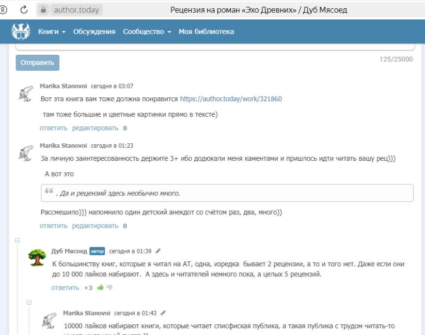 Например сегодня ночью постучался ко мне своими ответами под чужой рецой некий Дуб Мясоед. Поскольку отвечать под чужой рецой мне было неинтересно. то за внимание к своей персоне я пошла в виде бонуса инициатору трепаться под его свежевысыпанную рецензию.