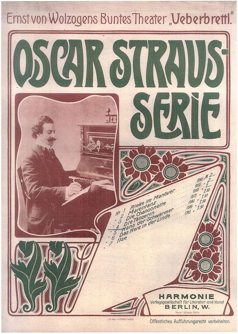 В Берлине с 1900 года Оскар Штраус работал пианистом и дирижером в первом немецком музыкальном кабаре «Юбербретль», где после него некоторое время служил и молодой Арнольд Шенберг. Это заведение приобрело огромную популярность благодаря песням, написанным для него Штраусом. Особой любовью пользовались песни «Веселый муж» и «О брошенном Леманне» на слова Отто Юлиуса Бирбаума, а также « Музыка приходит» – они имели невероятный успех. Кроме целого ряда лирических и политических песен, Штраус написал в 1900-х годах увертюру для оркестра «Жизнь — мечта», балет «Коломбина», ряд оперетт.