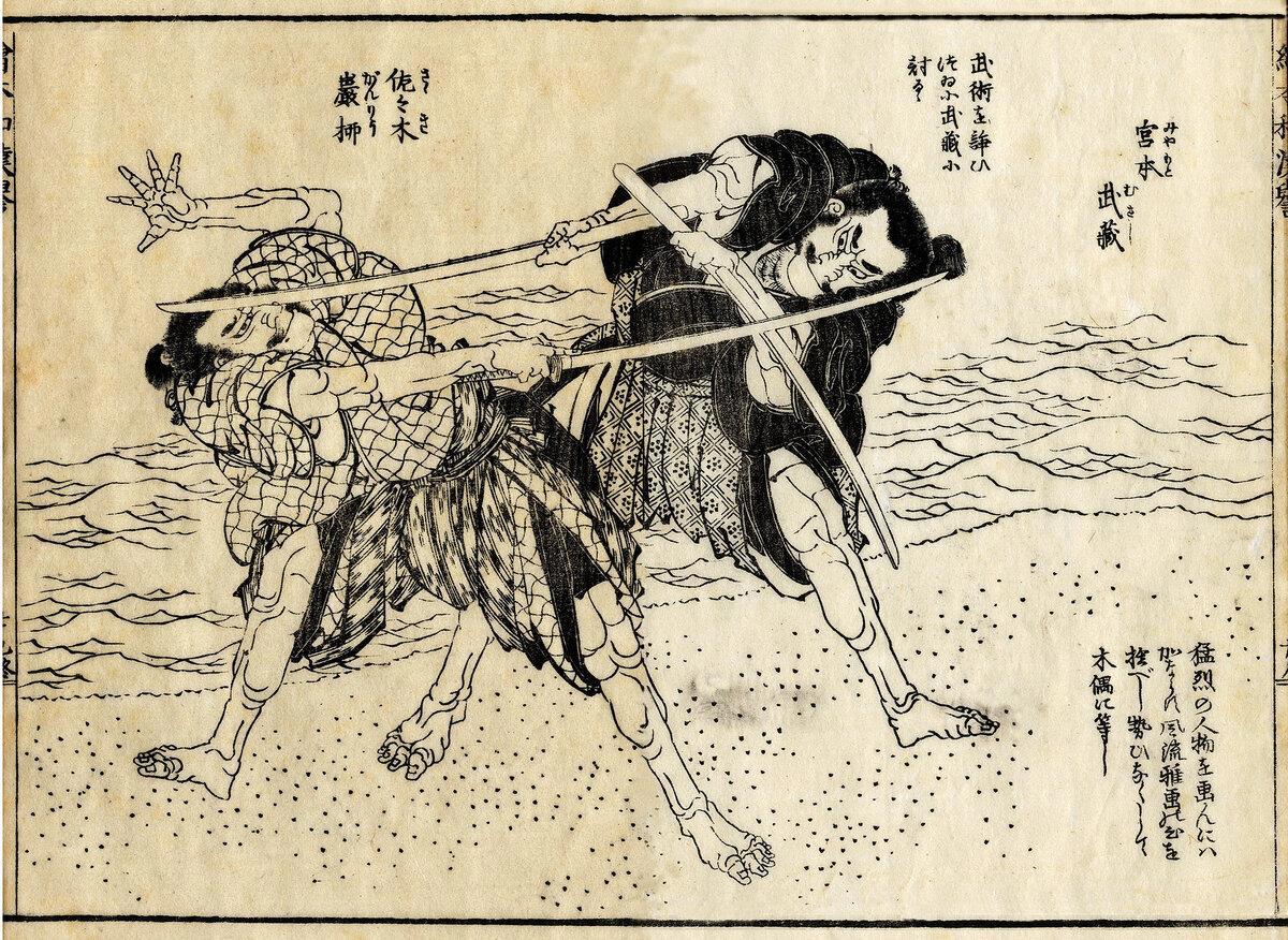 Поединок Мусаси и Кодзиро. На этой старинной гравюре, у Мусаси не весло, а два боккэна.