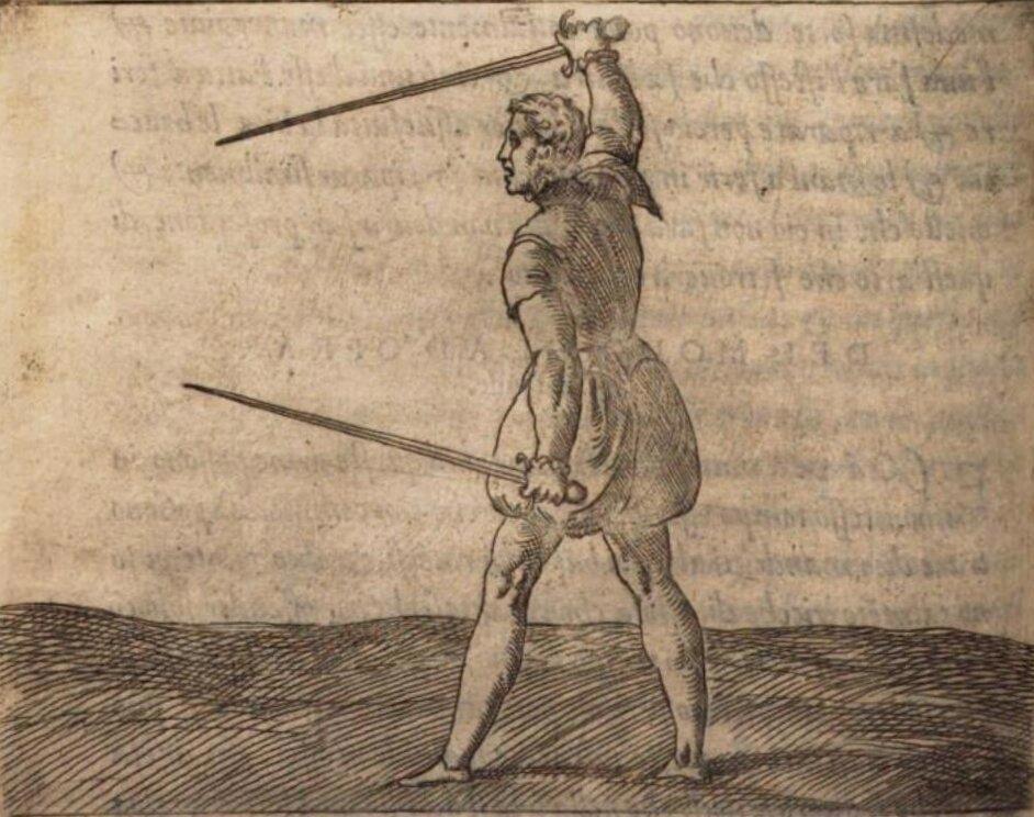 Боевая стойка фехтовальщика с двумя рапирами. Рисунок из фехтовального трактата Джакомо ди Грасси (1570 г.).